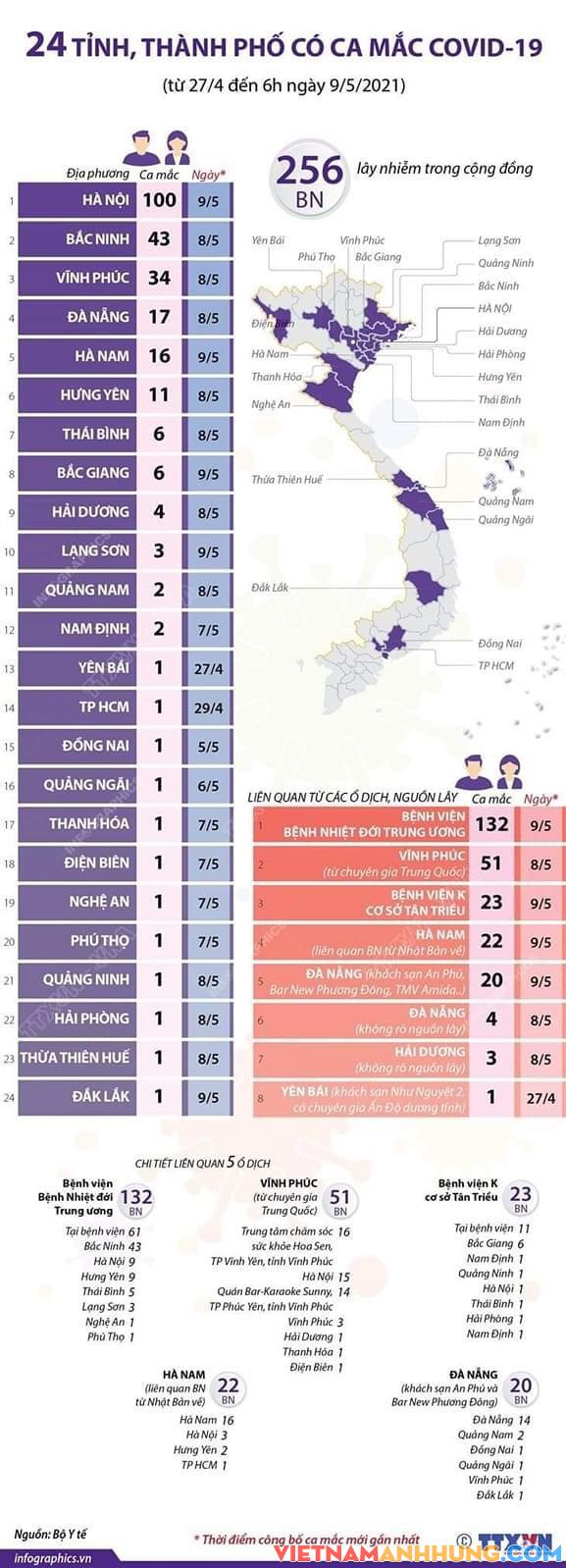 Từ 27/4 đến 6h ngày 9/5, Việt Nam đã ghi nhận 256 ca mắc COVID-19 trong cộng đồng tại 24 tỉnh, thành phố liên quan tới nhiều ổ dịch. Việt Nam hiện đã có tổng số 3.245 ca mắc COVID-19.