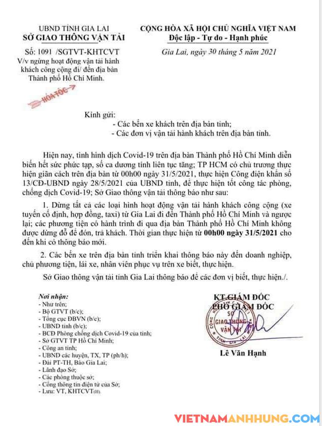 Ngày 30-5, Sở Giao thông-Vận tải tỉnh Gia Lai có Công văn hỏa tốc số 1091/SGTVT-KHTCVT về việc ngừng hoạt động vận tải hành khách công cộng đi/đến địa bàn TP. Hồ Chí Minh.