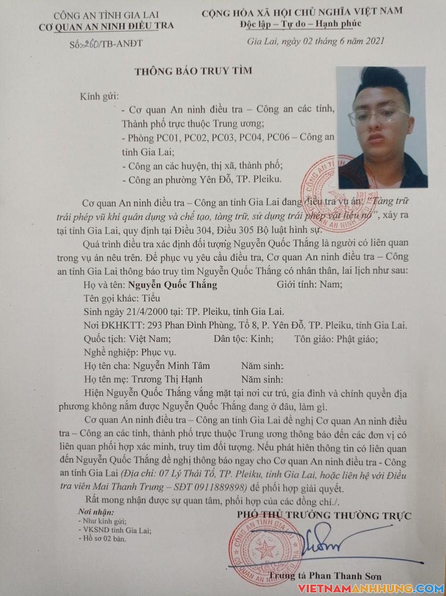 – Nguyễn Quốc Thắng (SN 21/4/2000, trú tại 293 Phan Đình Phùng, tổ 8, phường Yên Đỗ, TP. Pleiku).