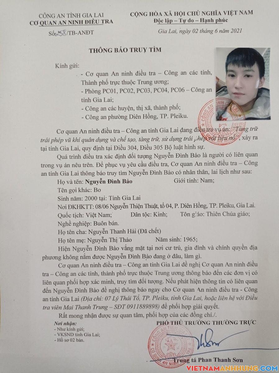 Cơ quan An ninh điều tra Công an tỉnh Gia Lai thông báo truy tìm 05 trường hợp liên quan vụ án “tàng trữ trái phép vũ khí quân dụng và chế tạo, tàng trữ, sử dụng trái phép vật liệu nổ” xảy ra tại tỉnh Gia Lai, gồm: