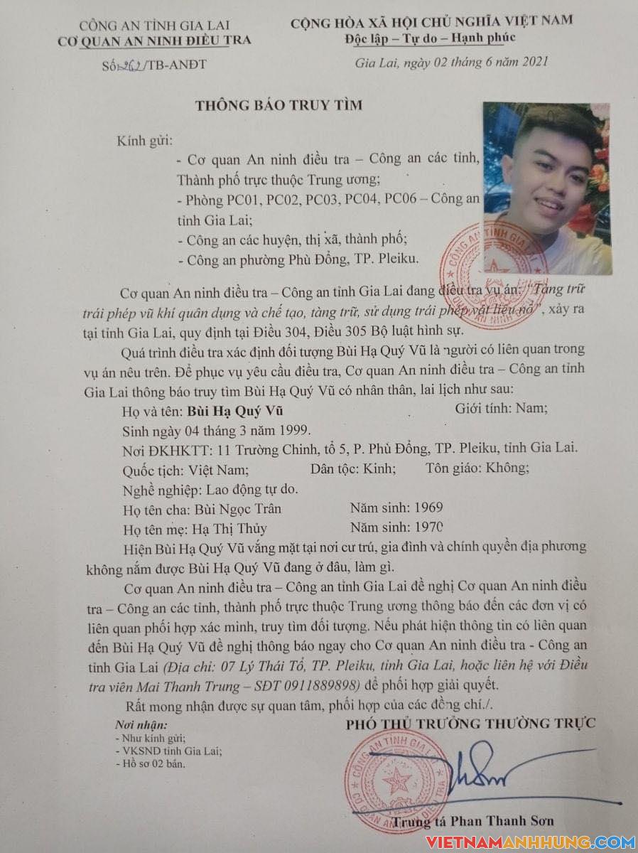 – Bùi Hạ Quý Vũ (SN 04/3/1999, trú tại 11 Trường Chinh, tổ 5, phường Phù Đổng, TP. Pleiku).