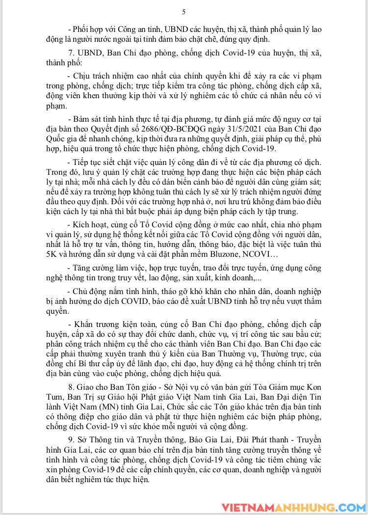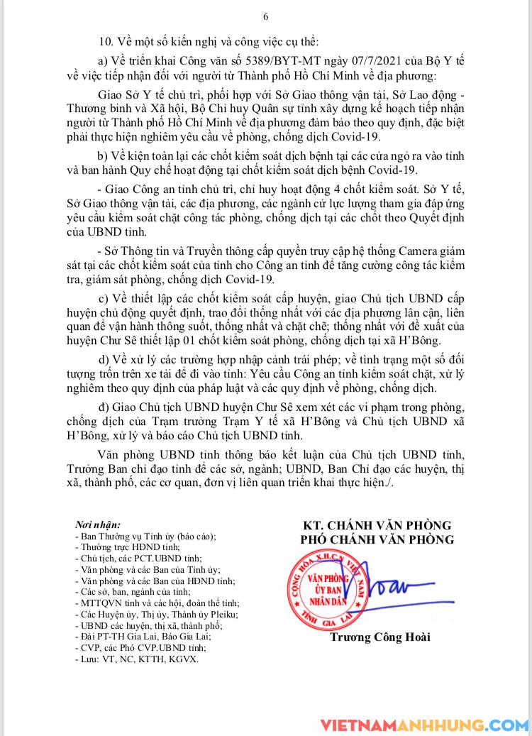 Riêng đối với huyên Chư Sê: Thực hiện phong tỏa chặt làng Kte thuộc xã H’Bông; khoanh vùng tạm thời xã H’Bông (thời gian mở khoanh vùng/phong toả do Ban Chỉ đạo tỉnh quyết định); tiếp tục điều tra, truy vết, xét nghiệm tầm soát kỹ, đúng phương châm khoanh vùng rộng, phong tỏa hẹp, truy vết nhanh, xét