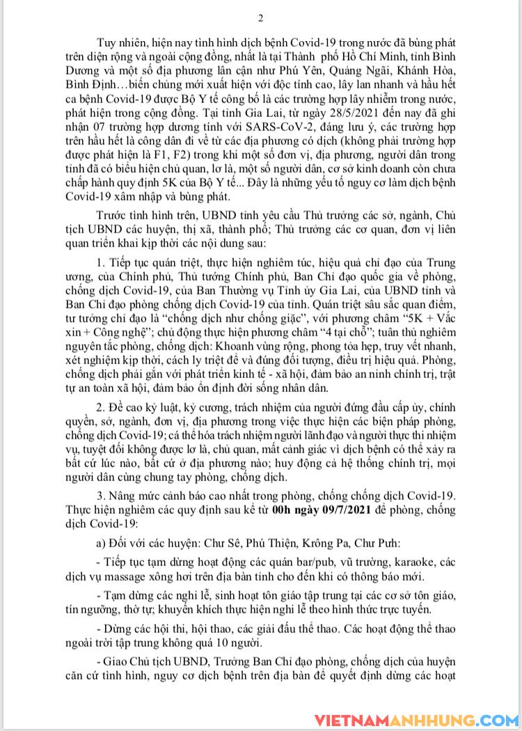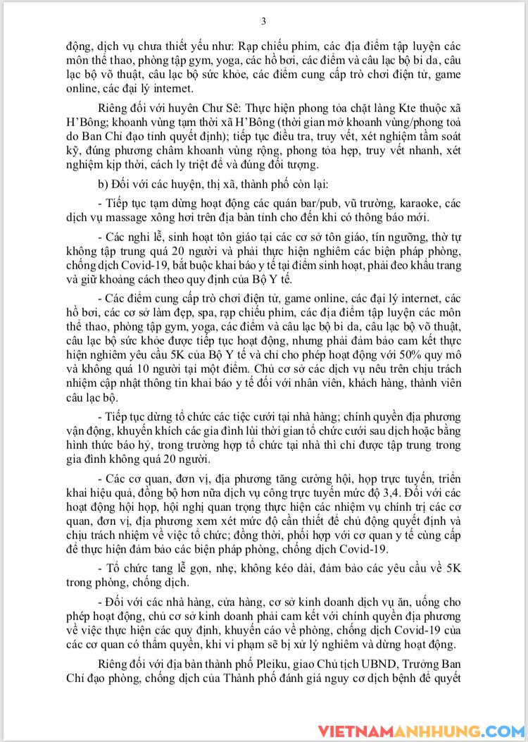 Riêng đối với địa bàn thành phố Pleiku, giao Chủ tịch UBND, Trưởng Ban Chỉ đạo phòng, chống dịch của Thành phố đánh giá nguy cơ dịch bệnh để quyết định các loại hình kinh doanh ăn uống tại vỉa hè vào ban đêm chỉ được bán mang đi, không phục vụ tại chỗ.