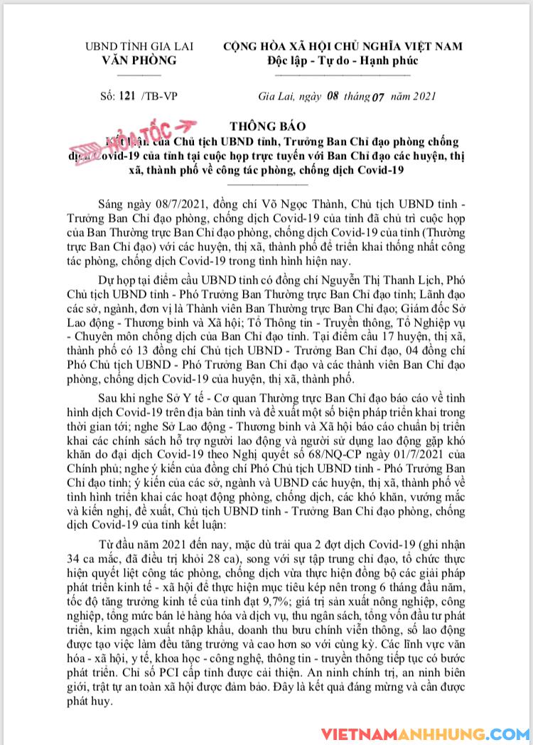 Văn phòng UBND tỉnh Gia Lai vừa có văn bản số 3190/VP-KGVX thông báo ý kiến của Trưởng ban Chỉ đạo phòng-chống...