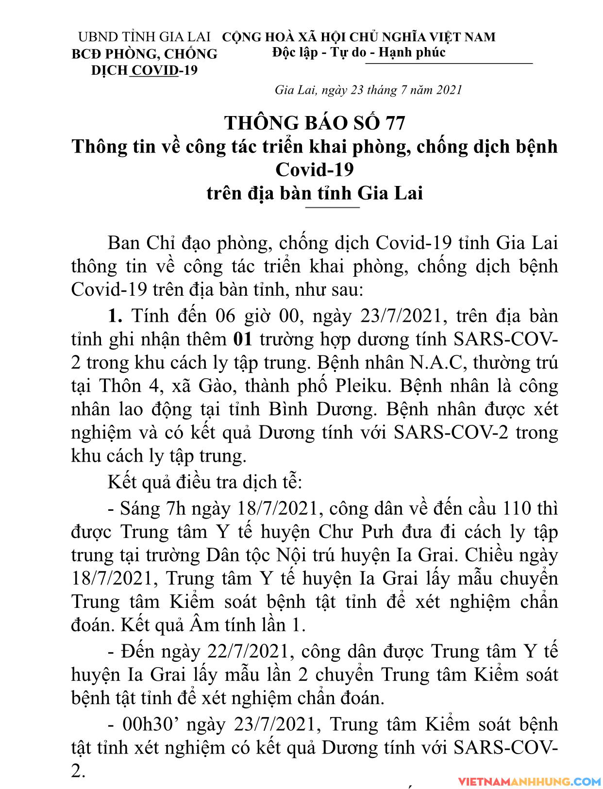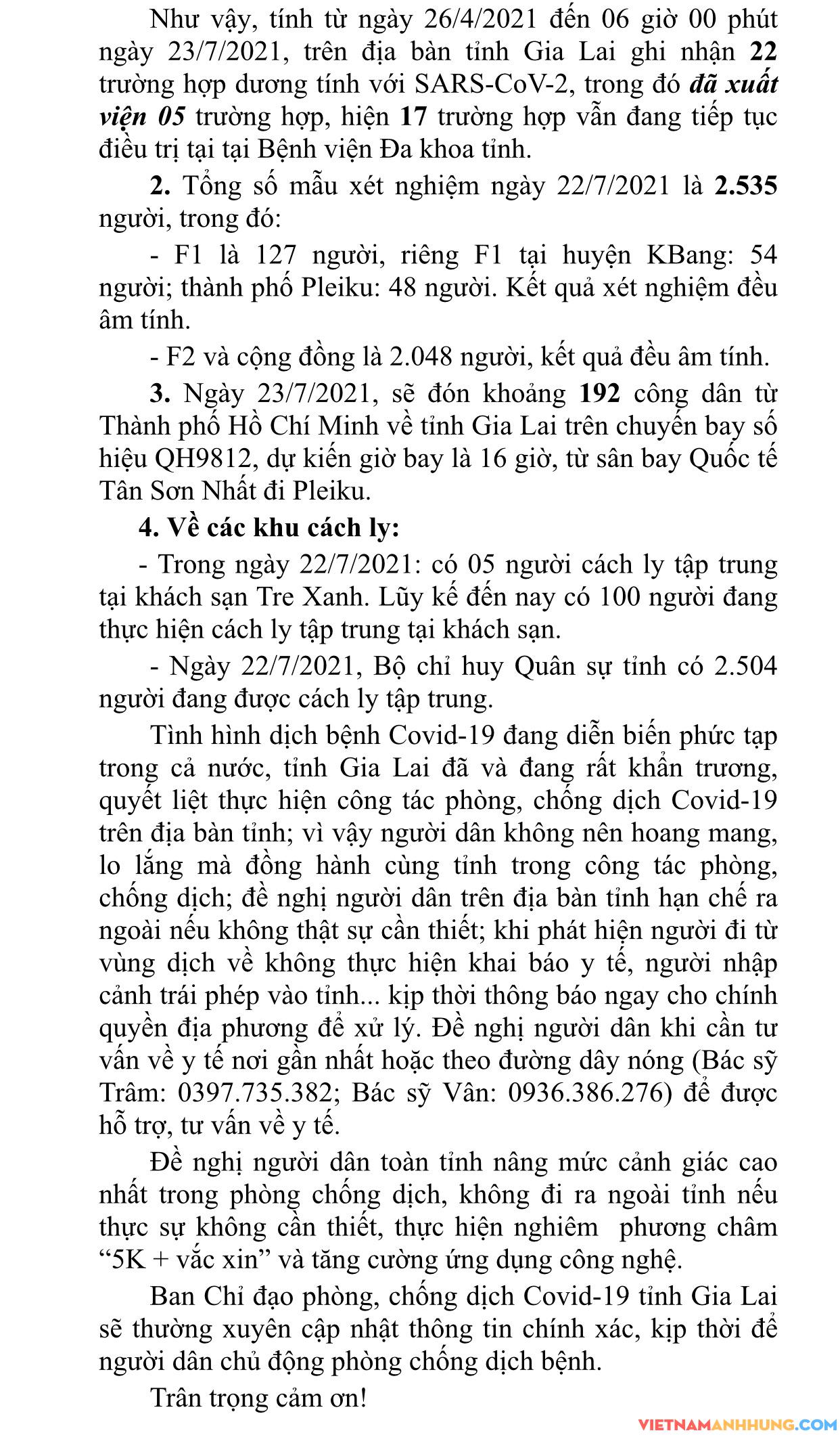 1. Tính đến 06 giờ 00, ngày 23/7/2021, trên địa bàn tỉnh ghi nhận thêm 01 trường hợp dương tính SARS-COV-2 trong khu cách ly tập trung. Bệnh nhân N.A.C, thường trú tại Thôn 4, xã Gào, thành phố Pleiku. Bệnh nhân là công nhân lao động tại tỉnh Bình Dương. Bệnh nhân được xét nghiệm và có kết quả Dương tính với SARS-COV-2 trong khu cách ly tập trung.