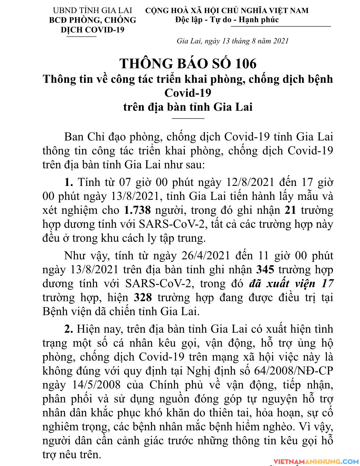 1. Tính từ 17 giờ 00 phút ngày 13/8/2021 đến 07 giờ 00 phút ngày 14/8/2021, tỉnh Gia Lai tiến hành lấy mẫu và xét nghiệm cho 2.095 người, trong đó ghi nhận 21 trường hợp dương tính với SARS-CoV-2, tất cả các trường hợp này đều ở trong khu cách ly tập trung.