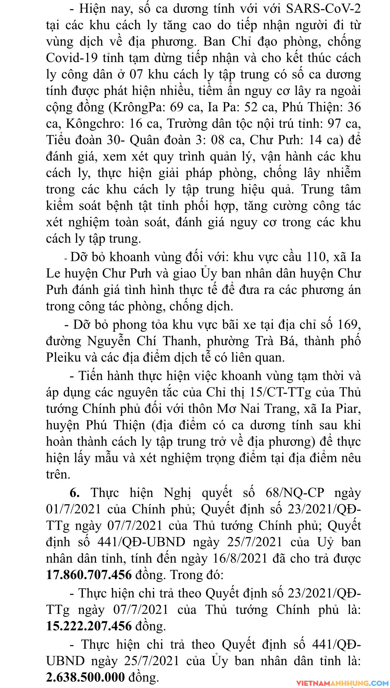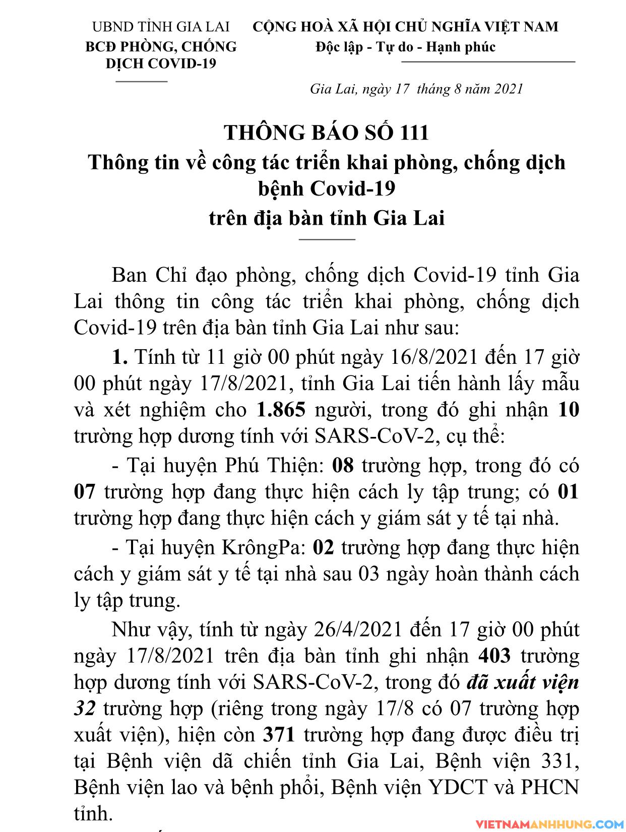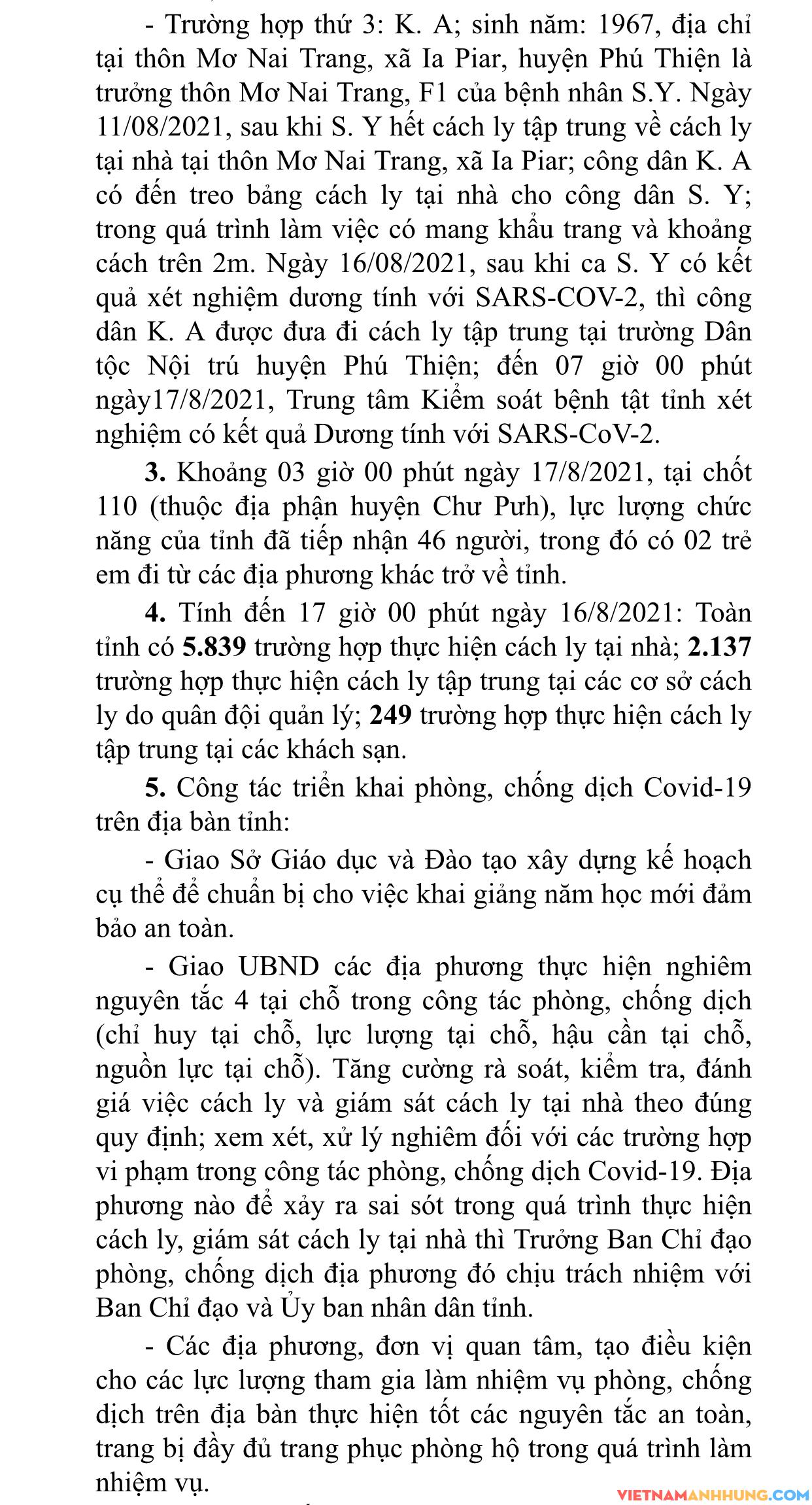1. Tính từ 11 giờ 00 phút ngày 16/8/2021 đến 17 giờ 00 phút ngày 17/8/2021, tỉnh Gia Lai tiến hành lấy mẫu và xét nghiệm cho 1.865 người, trong đó ghi nhận 10 trường hợp dương tính với SARS-CoV-2, cụ thể: