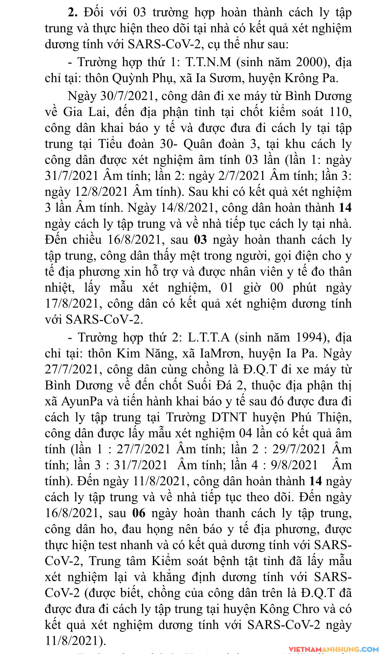 Ngày 30/7/2021, công dân đi xe máy từ Bình Dương về Gia Lai, đến địa phận tỉnh tại chốt kiểm soát 110, công dân khai báo y tế và được đưa đi cách ly tại tập trung tại Tiểu đoàn 30- Quân đoàn 3, tại khu cách ly công dân được xét nghiệm âm tính 03 lần (lần 1: ngày 31/7/2021 Âm tính; lần 2: ngày 2/7/2021 Âm tính; lần 3: ngày 12/8/2021 Âm tính). Sau khi có kết quả xét nghiệm 3 lần Âm tính. Ngày 14/8/2021, công dân hoàn thành 14ngày cách ly tập trung và về nhà tiếp tục cách ly tại nhà. Đến chiều 16/8/2021, sau 03 ngày hoàn thanh cách ly tập trung, công dân thấy mệt trong người, gọi điện cho y tế địa phương xin hỗ trợ và được nhân viên y tế đo thân nhiệt, lấy mẫu xét nghiệm, 01 giờ 00 phút ngày 17/8/2021, công dân có kết quả xét nghiệm dương tính với SARS-CoV-2.