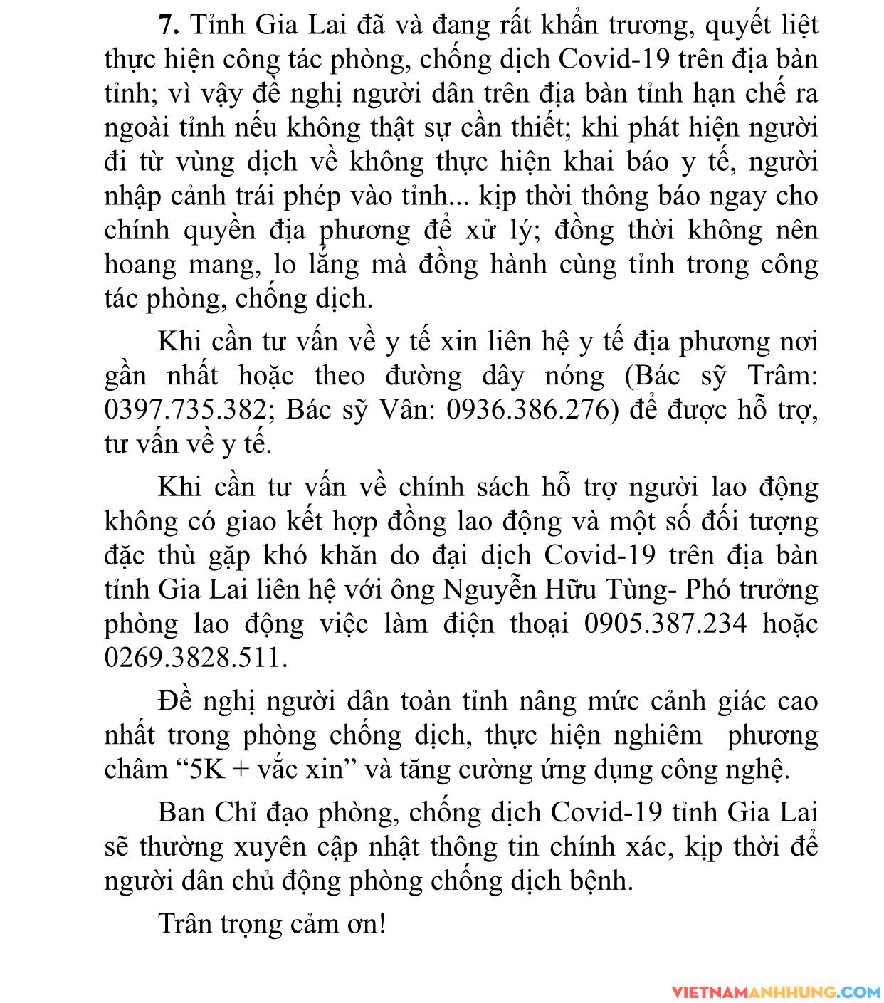7. Tỉnh Gia Lai đã và đang rất khẩn trương, quyết liệt thực hiện công tác phòng, chống dịch Covid-19 trên địa bàn tỉnh; vì vậy đề nghị người dân trên địa bàn tỉnh hạn chế ra ngoài tỉnh nếu không thật sự cần thiết; khi phát hiện người đi từ vùng dịch về không thực hiện khai báo y tế, người nhập cảnh trái phép vào tỉnh… kịp thời thông báo ngay cho chính quyền địa phương để xử lý; đồng thời không nên hoang mang, lo lắng mà đồng hành cùng tỉnh trong công tác phòng, chống dịch.