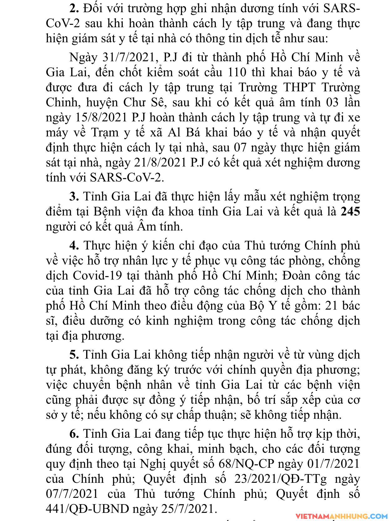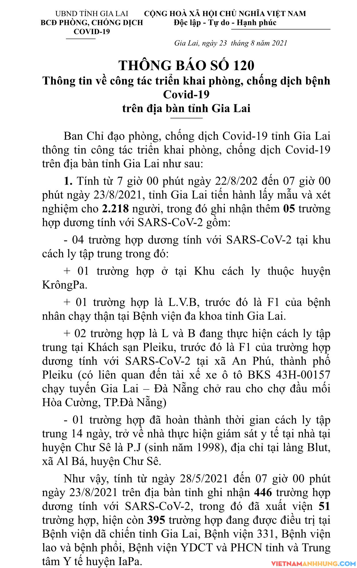 1. Tính từ 7 giờ 00 phút ngày 22/8/2021 đến 07 giờ 00 phút ngày 23/8/2021, tỉnh Gia Lai tiến hành lấy mẫu và xét nghiệm cho 2.218 người, trong đó ghi nhận thêm 05 trường hợp dương tính với SARS-CoV-2 gồm: