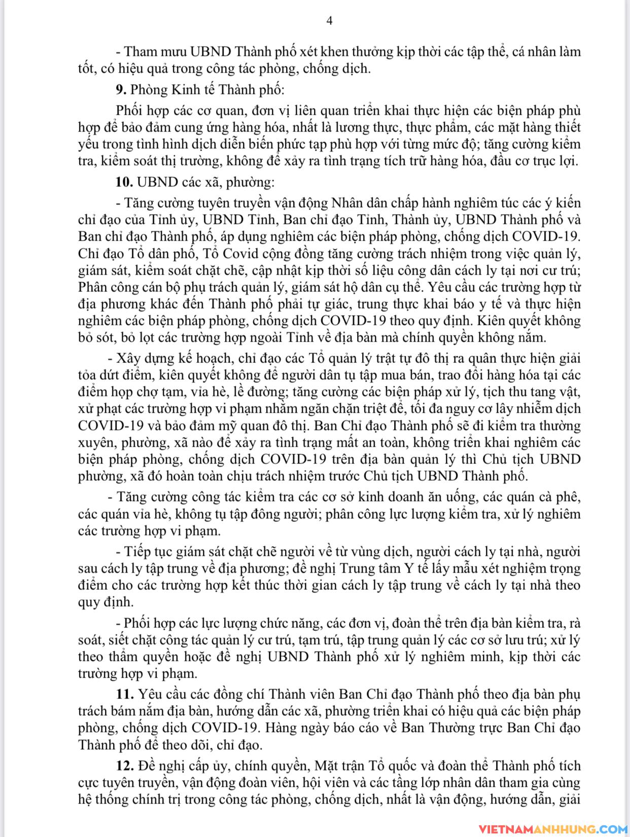 – Dừng các hoạt động hội họp, các sự kiện tập trung trên 20 người trong 1 phòng; không tụ tập từ 10 người trở lên ngoài phạm vi công sở, trường học, bệnh viện; yêu cầu thực hiện khoảng cách tối thiểu 2m giữa người với người tại các địa điểm công cộng.