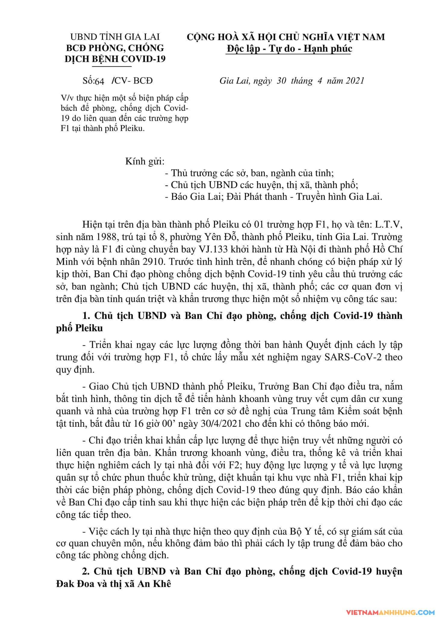 Ban Chỉ đạo phòng, chống dịch Covid-19 tỉnh Gia Lai yêu cầu thực hiện một số biện pháp cấp bách để phòng, chống dịch bệnh Covid-19 do liên quan đến các trường hợp F1 tại thành phố Pleiku: