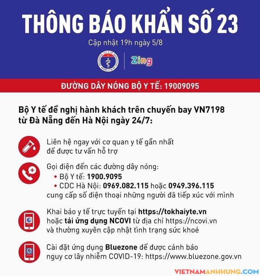 19h30 tối ngày 5/8, Bộ Y tế phát đi thông báo khẩn số 23 tìm hành khách trên chuyến bay VN7198 từ Đà Nẵng đến Hà Nội ngày 24/7