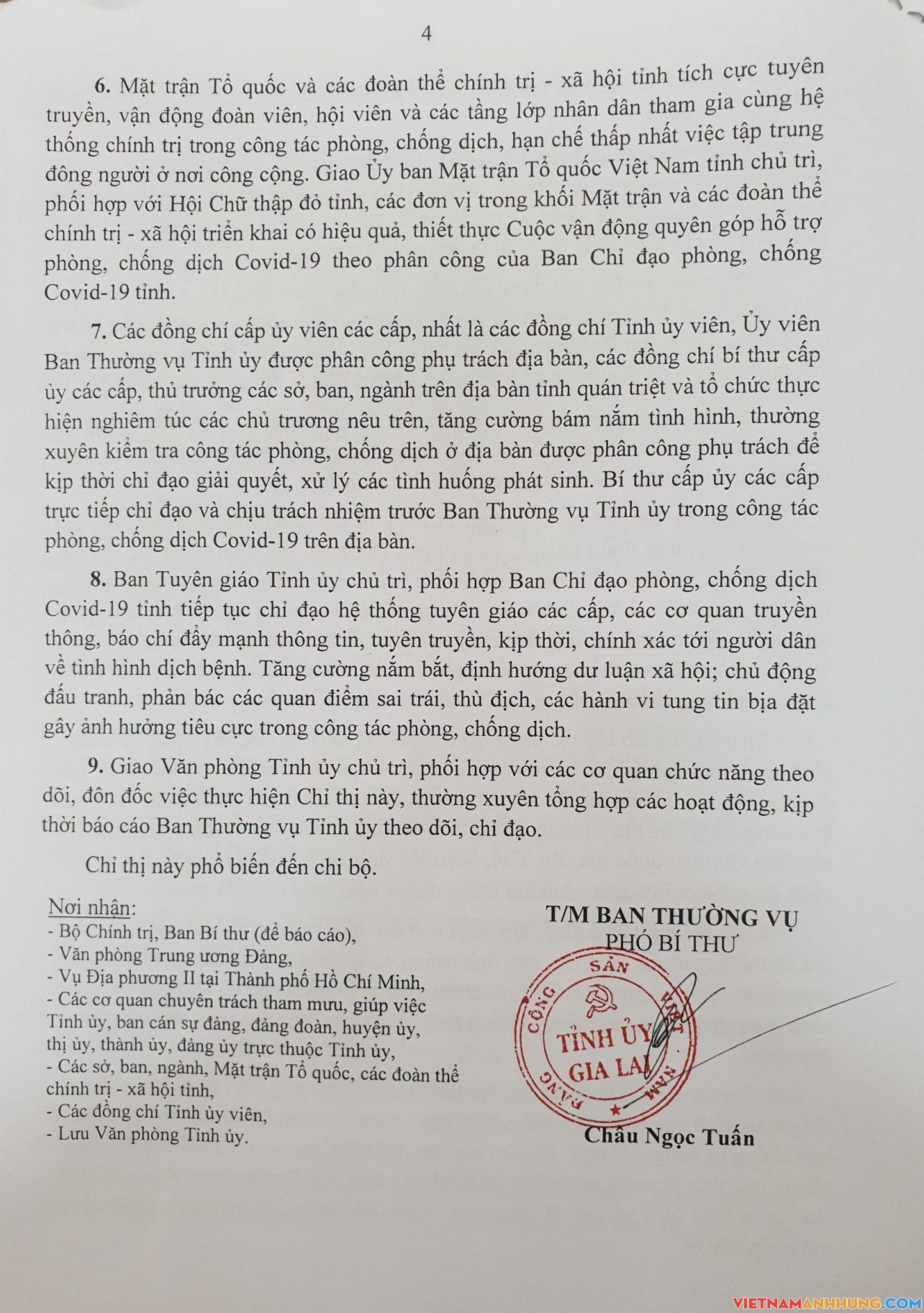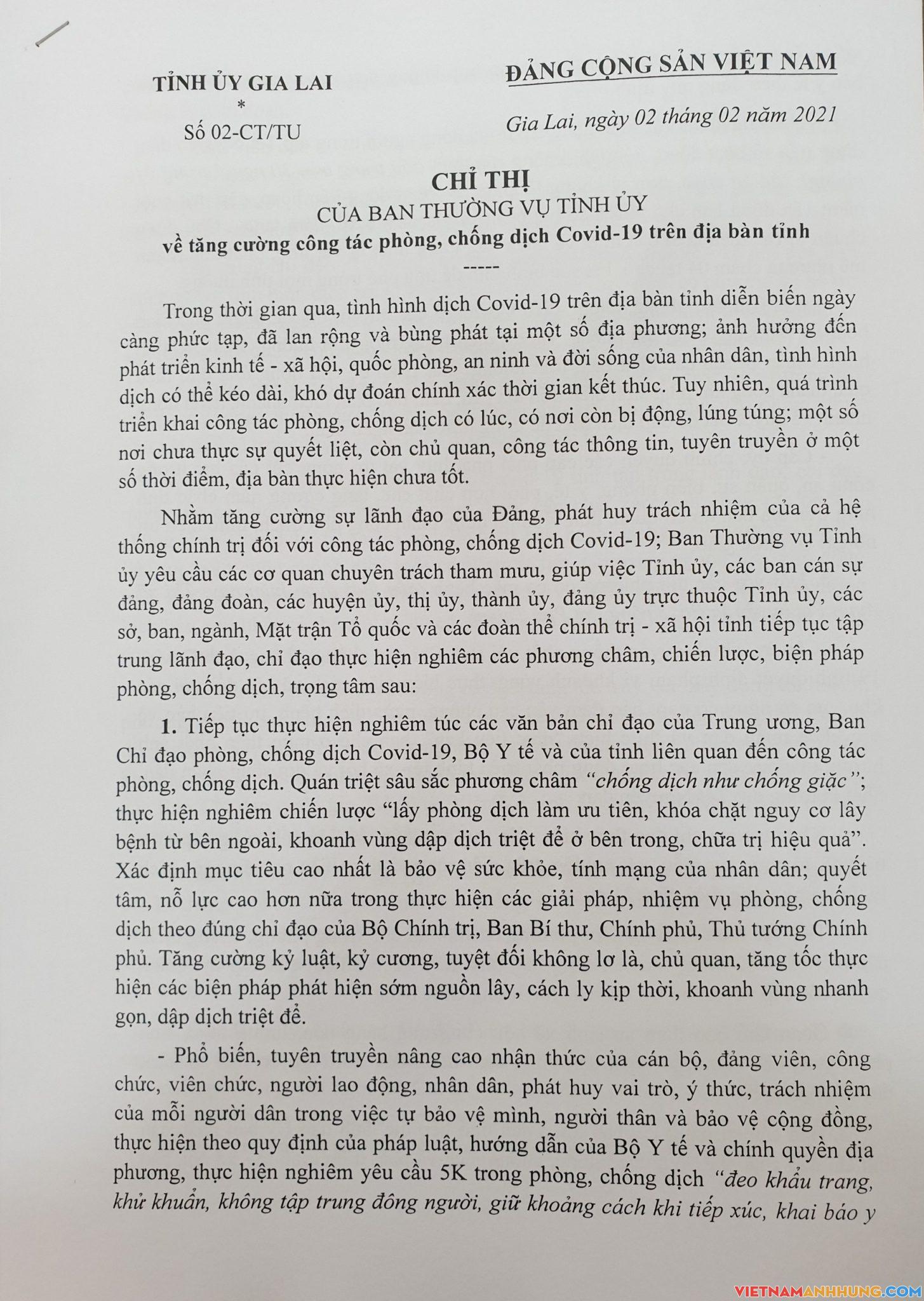 Chỉ thị của BTV về tăng cường phòng, chống Covid-19 trên địa bàn tỉnh
