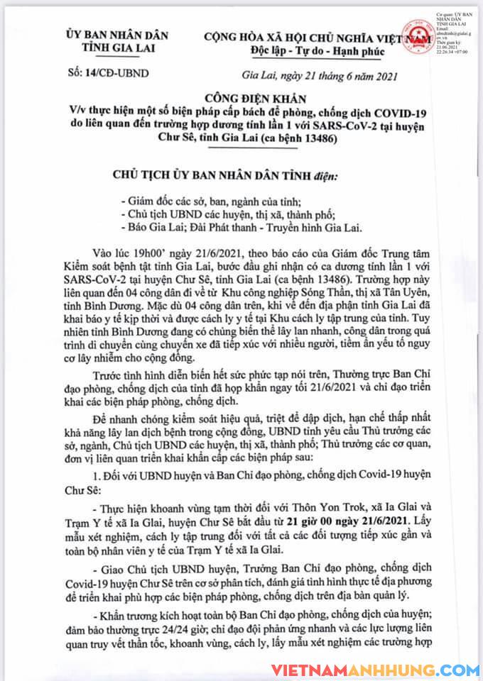 📣📣📣 CÔNG ĐIỆN KHẨN CỦA UBND TỈNH GIA LAI: Về việc thực hiện một số biện pháp cấp bách để phòng, chống dịch COVID-19 do liên quan đến trường hợp dương tính lần 1 với SARS-CoV-2 tại huyện Chư Sê, tỉnh Gia Lai (BN: 13486)!