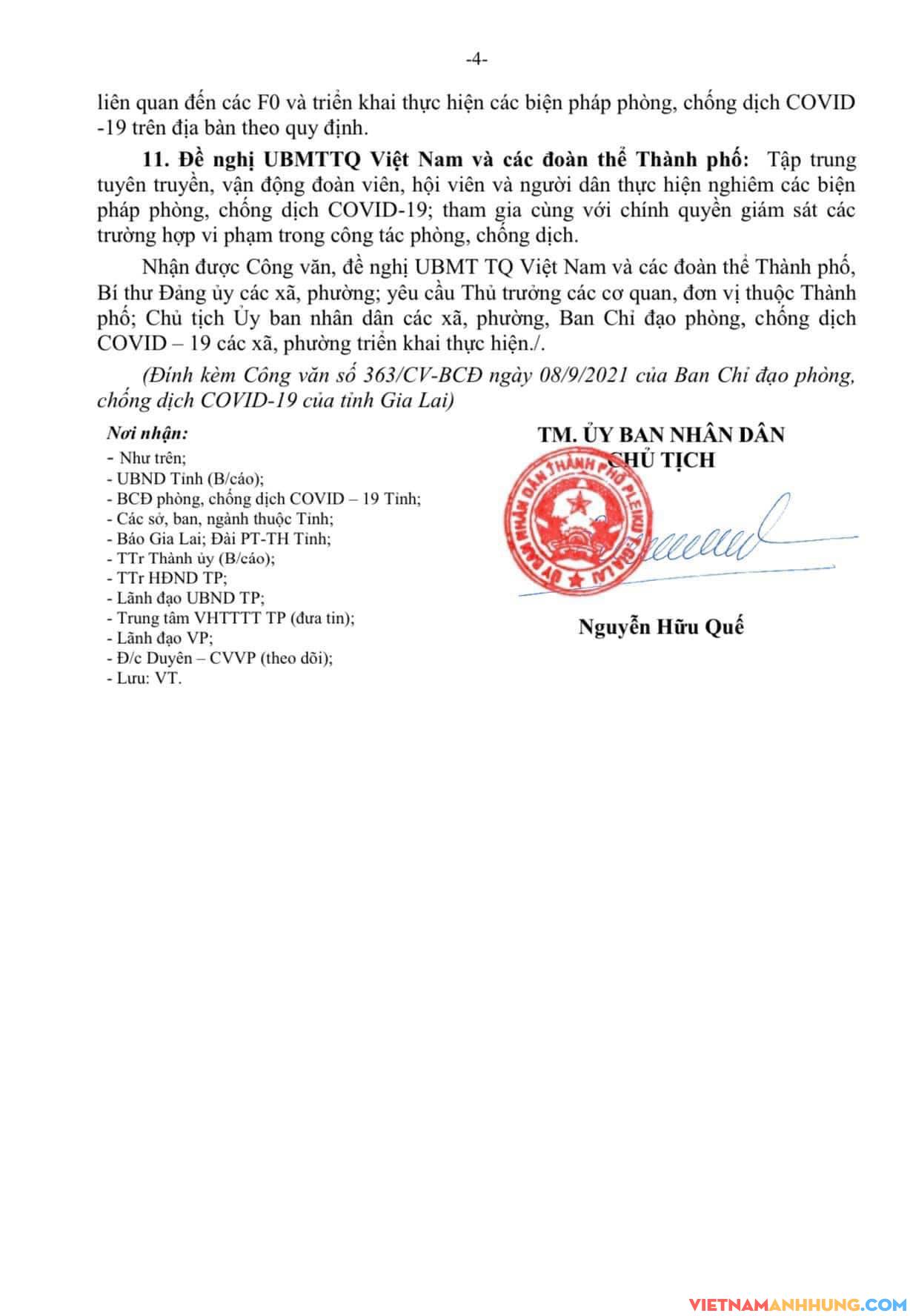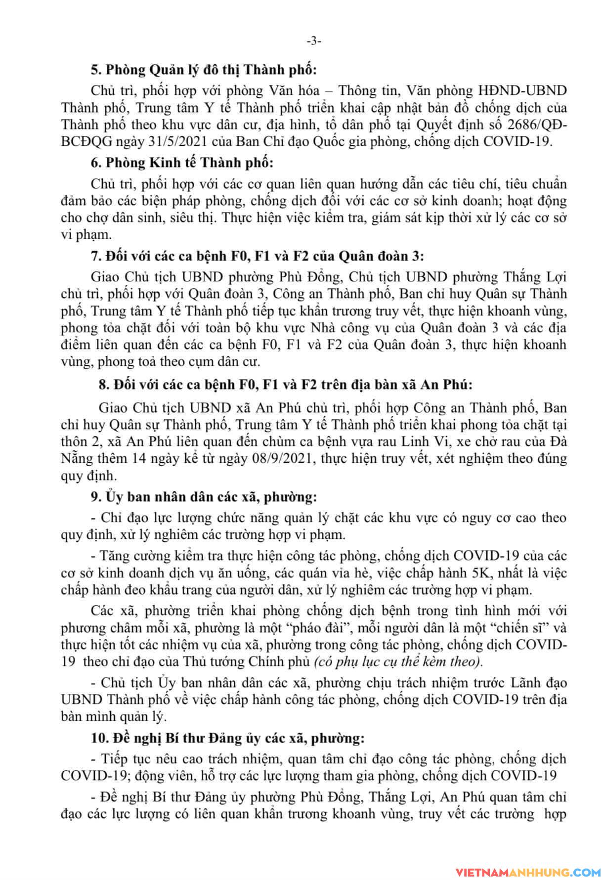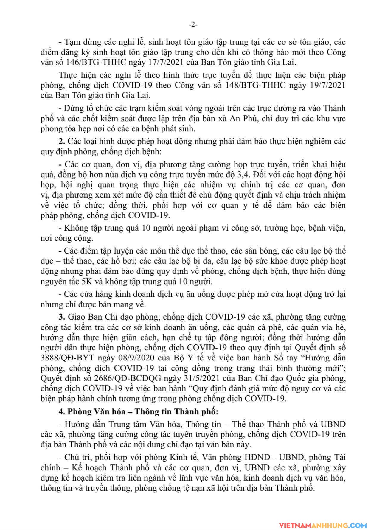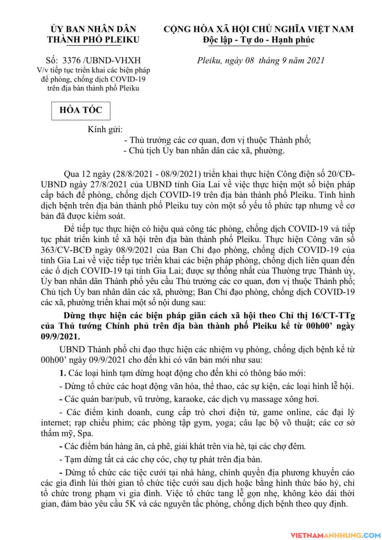 UBND Thành phố Pleiku vừa ban hành Văn bản số 3376 /UBND-VHXH, ngày 08/09/2021 về việc tiếp tục triển khai các biện pháp để phòng, chống dịch COVID-19 trên địa bàn TP Pleiku, cụ thể: