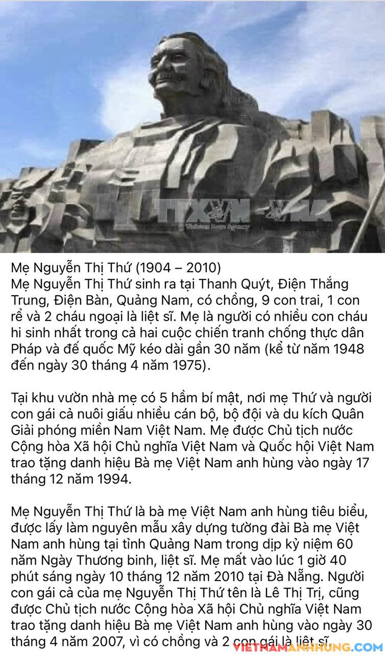 Hiếm có người mẹ nào trên thế giới này mang nhiều nỗi đau và sự hy sinh cho Tổ quốc như mẹ Thứ. Trong chống Pháp và Mỹ, mẹ Thứ lần lượt nhận 9 giấy báo tử của 9 con trai và nhận tin con rể cùng 2 cháu ngoại hy sinh.