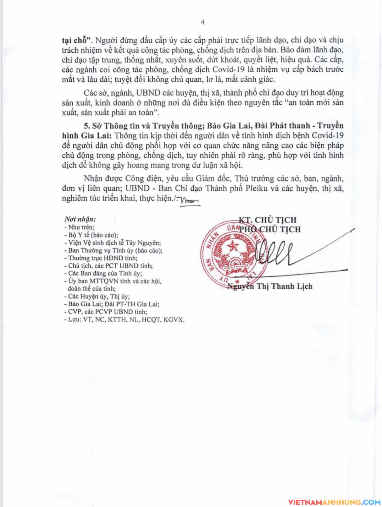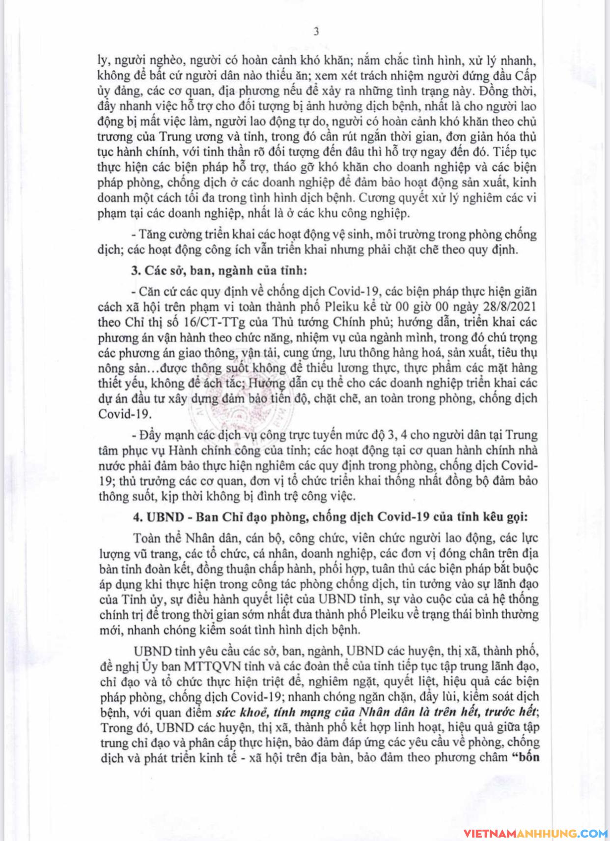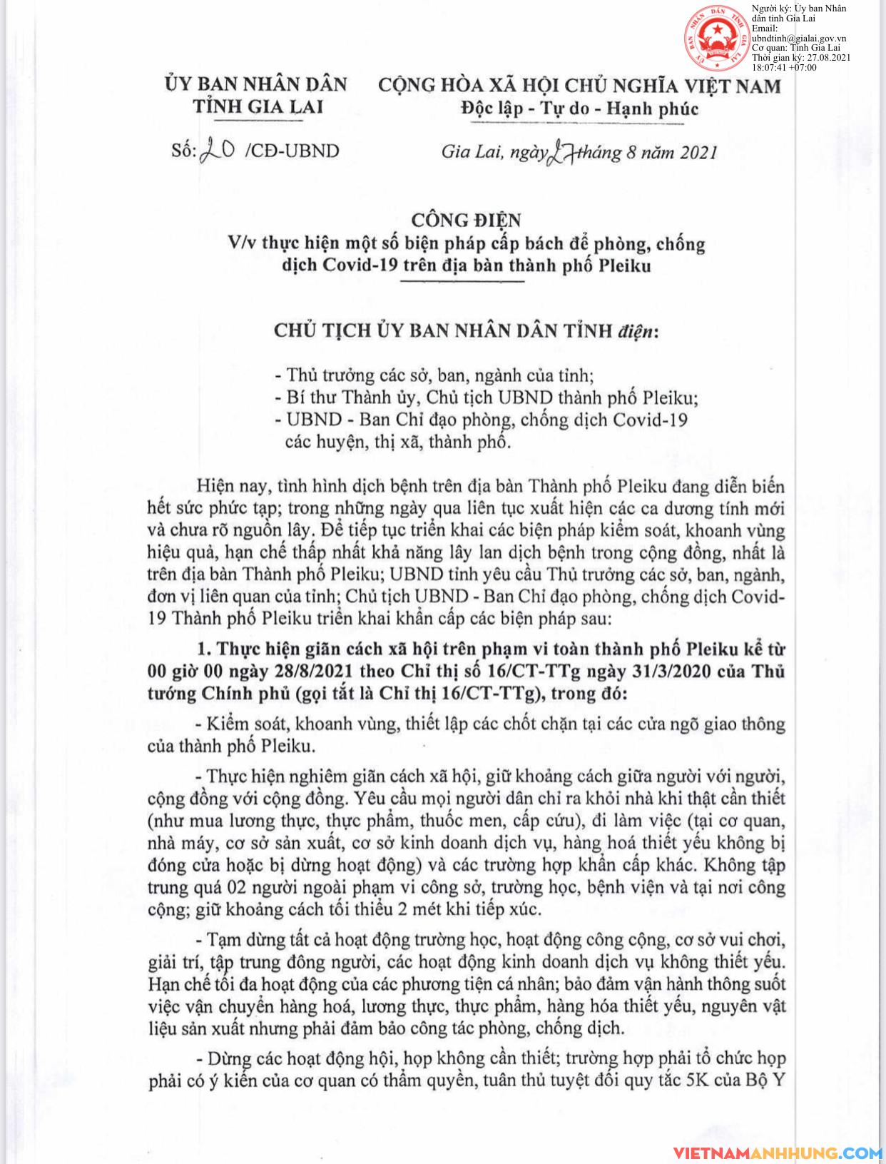 Chiều ngày 27/8/2021, UBND tỉnh Gia Lai có Công điện số 20/CĐ-UBND về việc thực hiện một số biện pháp cấp bách để phòng chống dịch Covid-19 trên địa bàn thành phố Pleiku, cụ thể như sau: