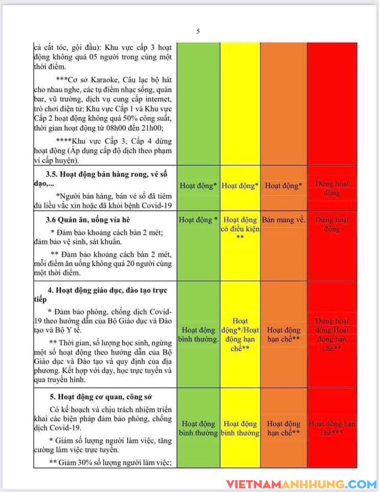 Hoạt động ngoài trời tại khu vực cấp 1: Được hoạt động không hạn chế số người. Khu vực cấp 2: Nếu đảm bảo điều kiện 100% người tham gia đã được tiêm đủ liều vắc xin hoặc đã khỏi bệnh Covid-19 thì không hạn chế số người. Nếu không đảm bảo điều kiện thì số người tham gia không quá 70 người. Khu vực cấp 3: Nếu đảm bảo điều kiện 100% người tham gia đã được tiêm đủ liều vắc xin hoặc đã khỏi bệnh Covid-19 thì số người tham gia không quá 150 người; nếu không đảm bảo điều kiện thì số người tham gia không quá 50 người. Khu vực cấp 4: Dừng hoạt động, ngoại trừ các nhiệm vụ chính trị, kinh tế-xã hội, quốc phòng an ninh, các nhiệm vụ đặc biệt khác… sẽ do Ban Chỉ đạo phòng-chống dịch cấp huyện, tỉnh quyết định. Tổ chức đám cưới ở khu vực cấp 3; đám tang ở khu vực cấp 3, cấp 4 phải báo cáo và có sự giám sát của UBND cấp xã.