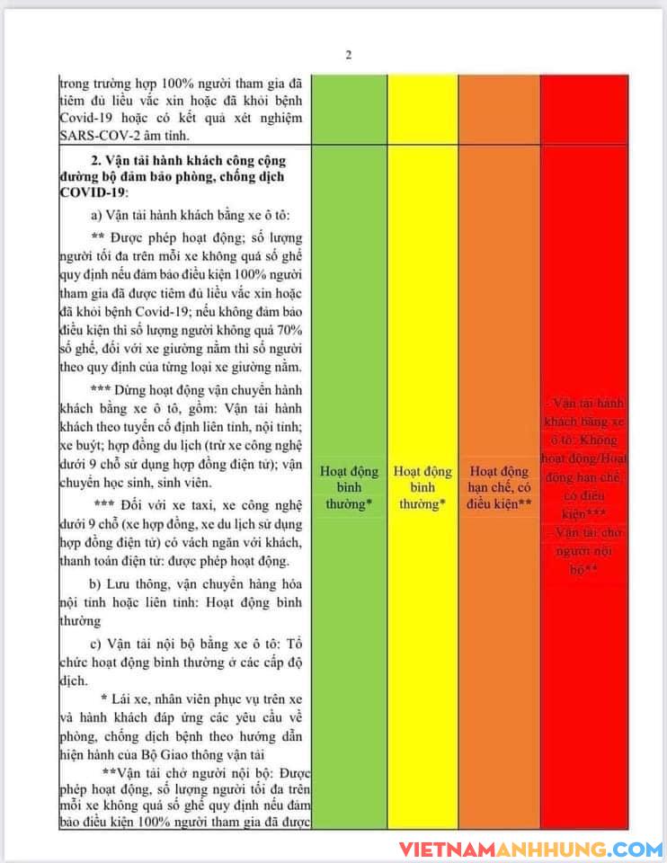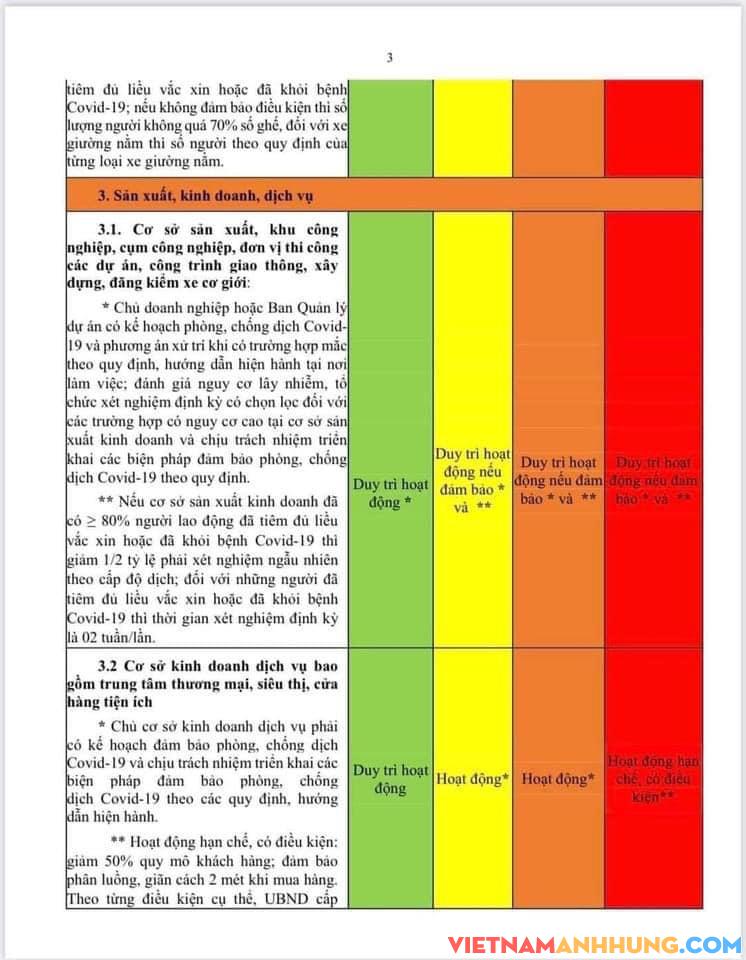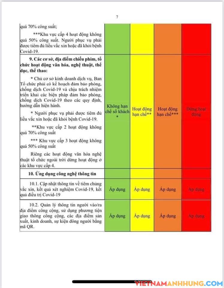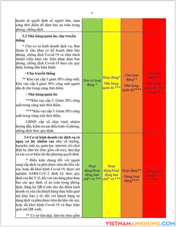 Phương án cũng quy định đối với các hoạt động giao thông, vận tải; sản xuất, kinh doanh, dịch vụ; giáo dục, đào tạo trực tiếp; lớp giáo dục nghề nghiệp; hoạt động cơ quan, công sở; cơ sở tôn giáo, tín ngưỡng, thờ tự; địa điểm nghỉ dưỡng, khách sạn, nhà nghỉ, tham quan du lịch; địa điểm chiếu phim, tổ chức hoạt động văn hóa, nghệ thuật, thể dục, thể thao.Trong đó, chợ ở khu vực cấp 1, 2 hoạt động bình thường, cấp 3 giảm 30% công suất, cấp 4 giảm 50% công suất người dân đi chợ trong cùng thời điểm. Nhà hàng, quán ăn, uống được hoạt động bình thường ở khu vực cấp 1; các khu vực cấp 2, 3 lần lượt giảm 20%, 50% công suất; khu vực cấp 4 thực hiện bán mang về. Đối với quán ăn, uống tại khu công cộng, vỉa hè tại khu vực cấp 1 được hoạt động có điều kiện; khu vực cấp 2 hoạt động có điều kiện và không quá 20 người; khu vực cấp 3 chỉ được bán mang về và tạm dừng hoạt động tại khu vực cấp 4…