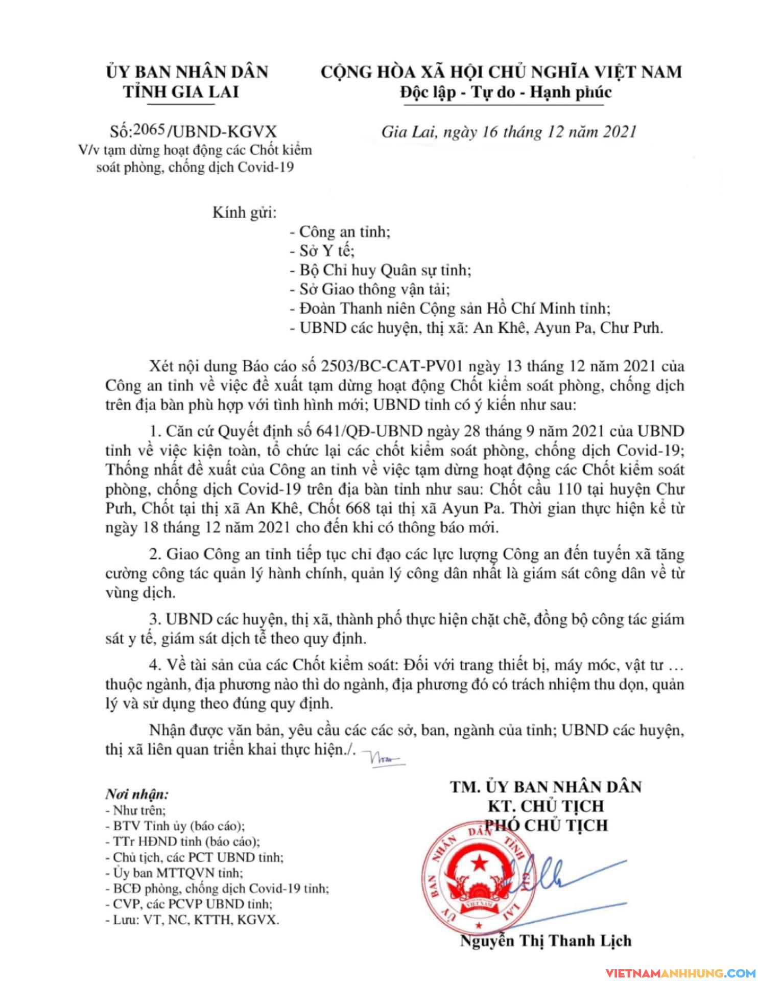 Ngày 16/12/2021, UBND tỉnh Gia Lai ban hành Thông báo số 2065/UBND-KGVX về việc tạm dừng hoạt động các Chốt kiểm soát phòng, chống dịch Covid-19 trên địa bàn tỉnh Gia Lai, từ 18/12/2021 cho đến khi có thông báo mới.