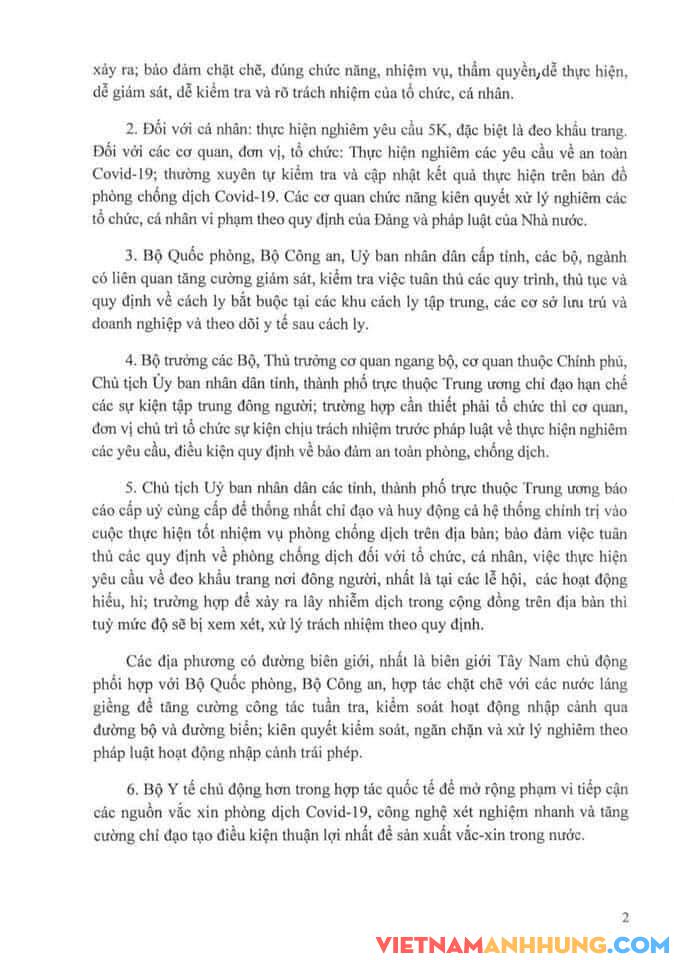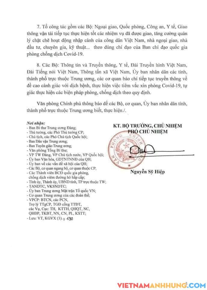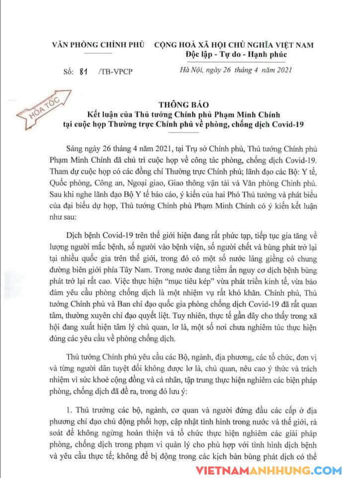 Thông báo hỏa tốc kết luận của Thủ tướng Chính phủ tại cuộc họp Thường trực Chính phủ về phòng, chống dịch COVID-19.