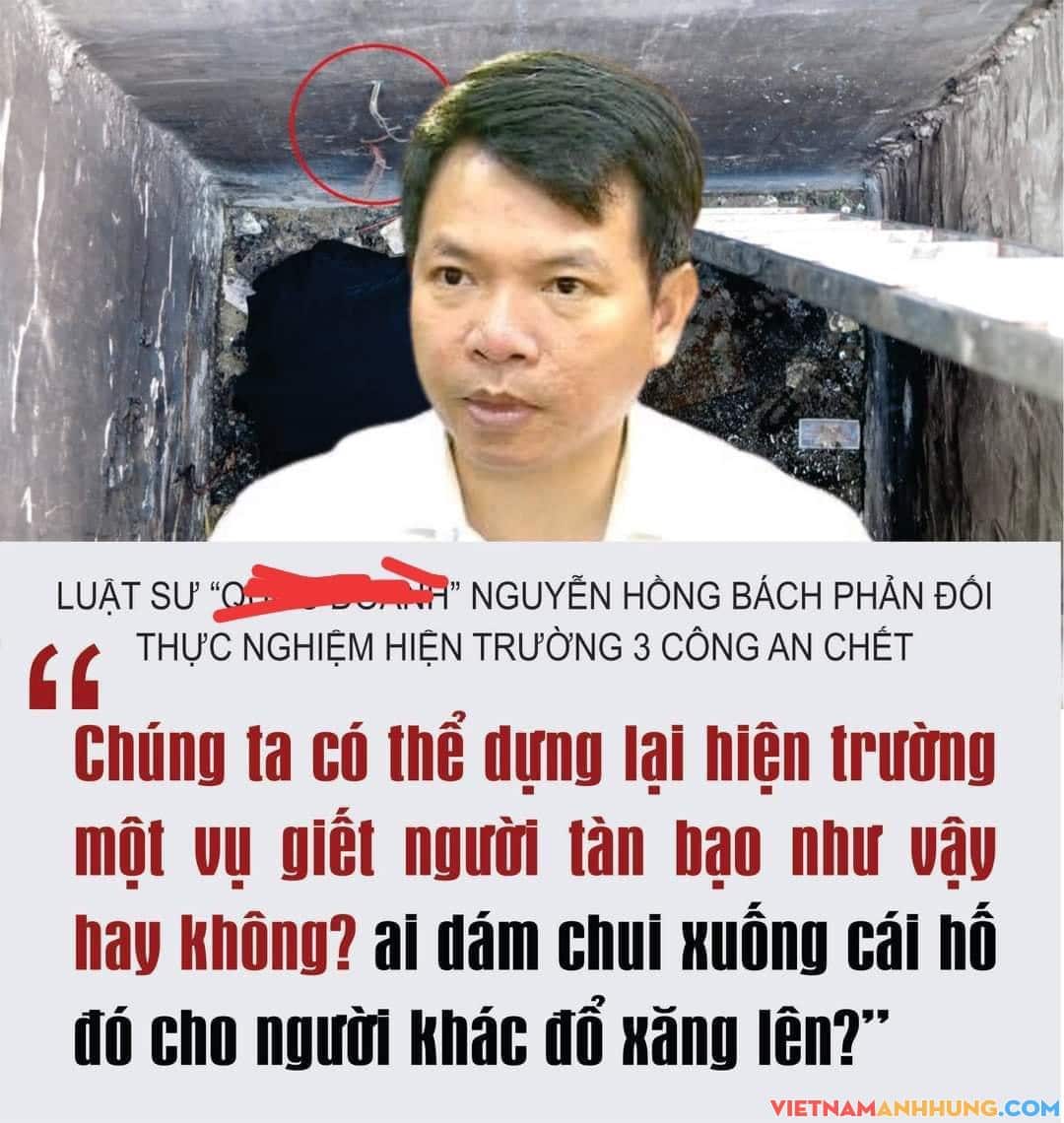 Luật sư Nguyễn Hồng Bách là người phản đối việc thực nghiệm hiện trường, ông ấy cho rằng “chúng ta có thể dựng lại hiện trường một vụ giết người tàn bạo như vậy không? Ai dám chui xuống cái hố để người khác đổ xăng lên?”. Nguyễn Hồng Bách vừa dứt lời thì cả phiên toà im phăng phắc, đám luật sư “quạ đen” như bị mũi tên xuyên vào cuống họng. Anh luật sư Nguyễn Hồng Bách không những nói chính xác, mà phát biểu này còn mang theo “hàm lượng nhân văn” rất cao, thể hiện lương tri của con người. Xin cảm ơn luật sư vì đã nói hộ tiếng lòng của nhân dân Việt Nam! Tại sao phải thực nghiệm lại hiện trường để gợi lại nỗi đau cho gia đình của 3 chiến sĩ công an hi sinh vì đất nước, trong khi mọi chứng cứ đã đầy đủ, thuyết phục và các bị cáo đều nhận tội, đồng ý với bản cáo trạng của Viện Kiểm sát và từ chối luật sư bào chữa cho mình?
