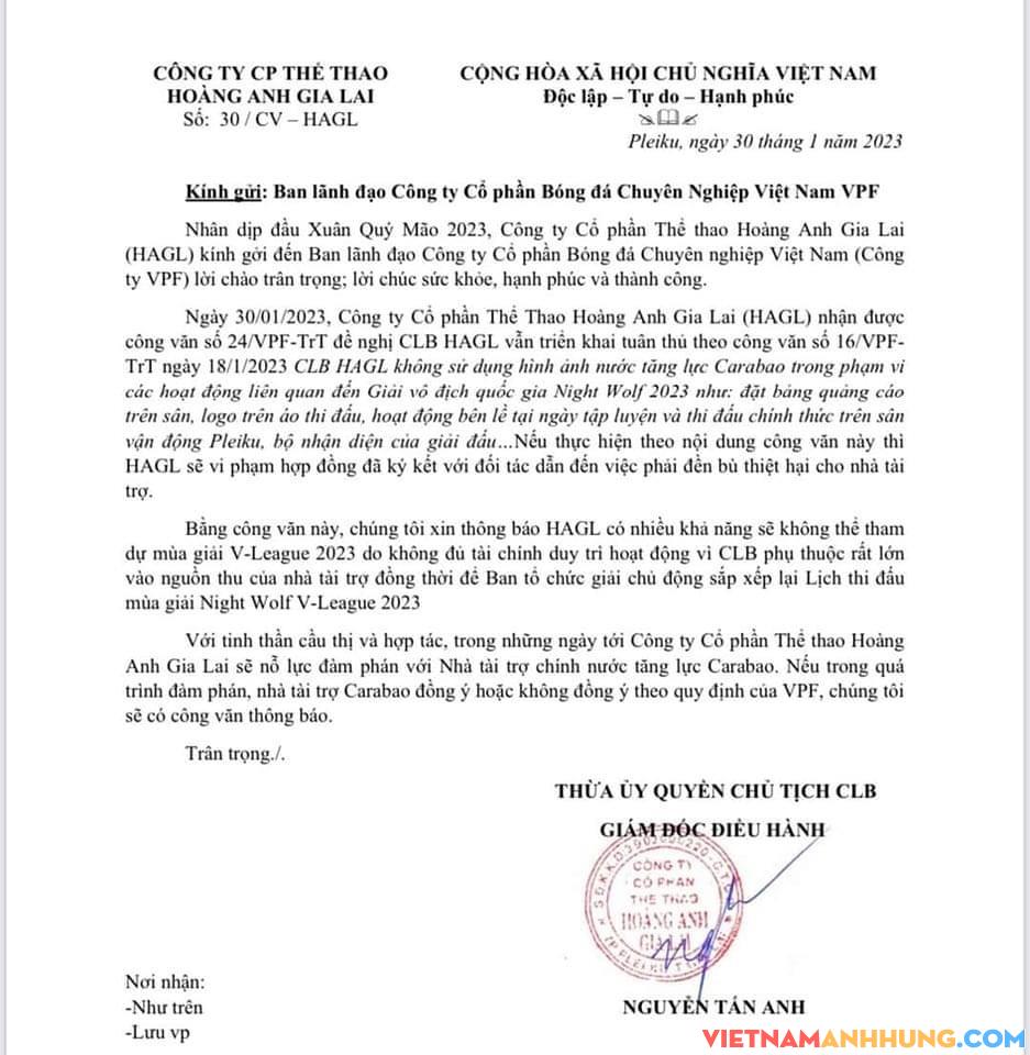 Thông tin mới nhất, CLB HAGL vẫn giữ lập trường: Nếu không được VPF chấp thuận nhà tài trợ Carabao, HAGL xin rút khỏi giải và đề nghị BTC sắp xếp lại lịch thi đấu!