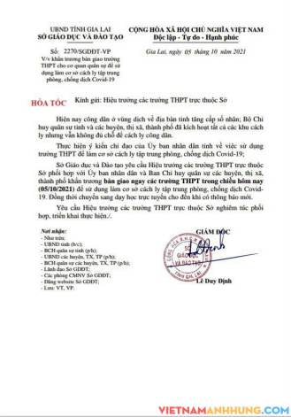 Ngày 05/10/2021, Sở Giáo dục và đào tạo có Công văn hoả tốc số 2270/SGDĐT-VP về việc giao các trường THPT khẩn trương bàn giao trường cho cơ quan quân sự để làm cơ sở cách ly tập trung phòng, chống dịch Covid-19.