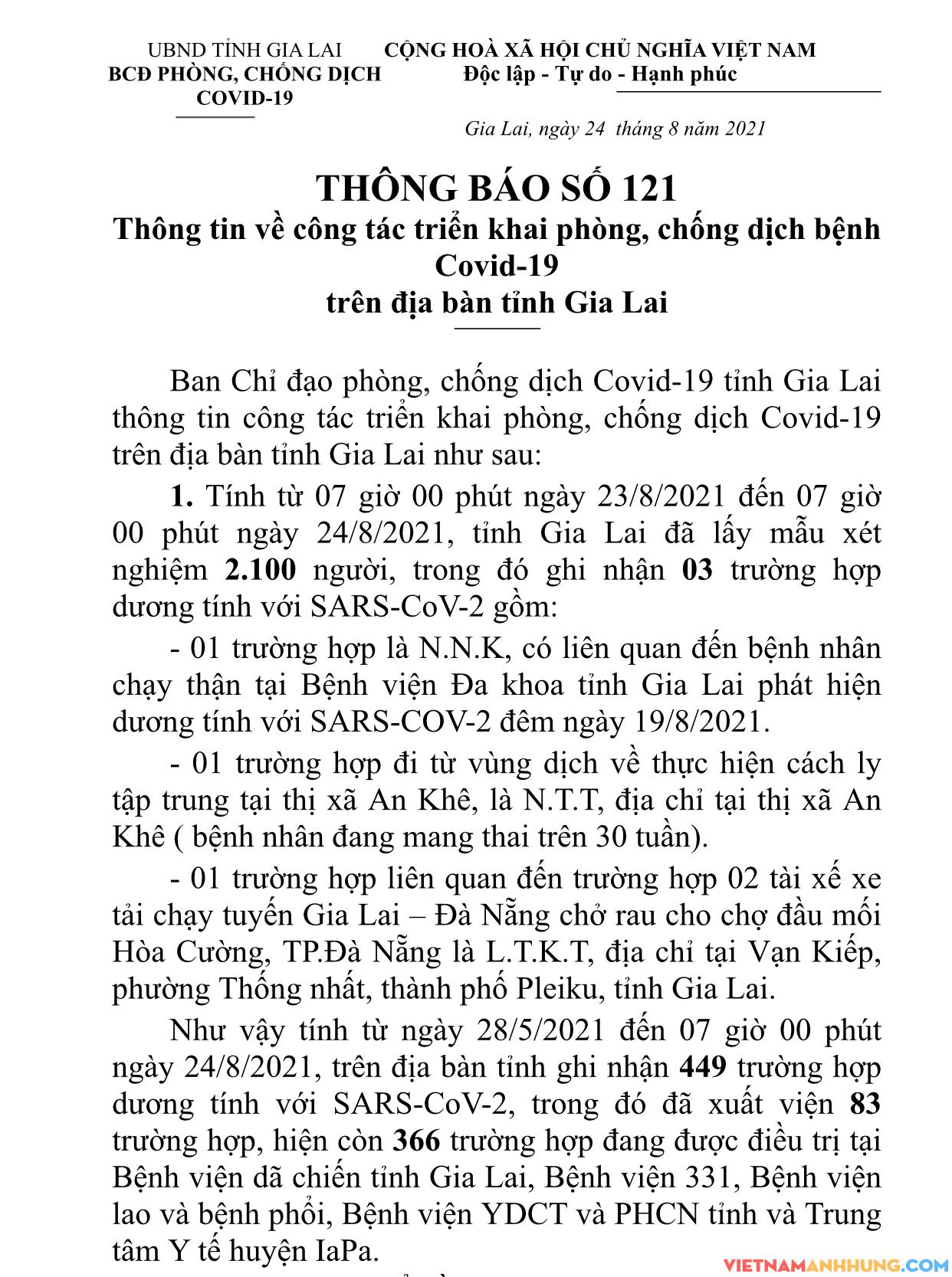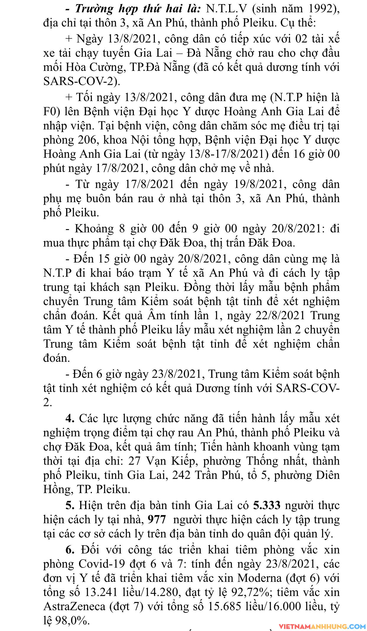 1. Tính từ 07 giờ 00 phút ngày 23/8/2021 đến 07 giờ 00 phút ngày 24/8/2021, tỉnh Gia Lai đã lấy mẫu xét nghiệm 2.100 người, trong đó ghi nhận 03 trường hợp dương tính với SARS-CoV-2 gồm: