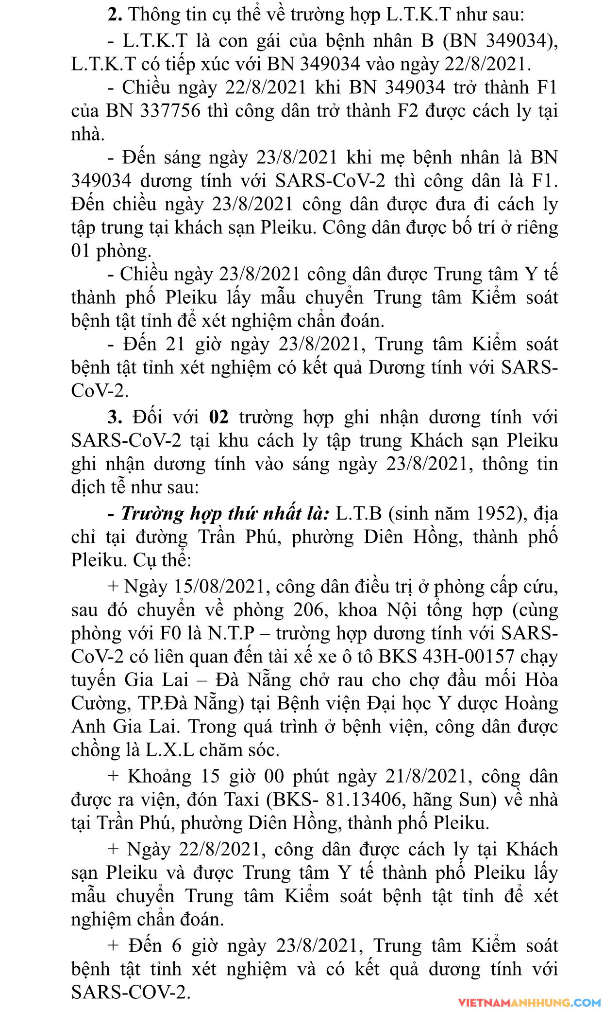 3. Đối với 02 trường hợp ghi nhận dương tính với SARS-CoV-2 tại khu cách ly tập trung Khách sạn Pleiku ghi nhận dương tính vào sáng ngày 23/8/2021, thông tin dịch tễ như sau: