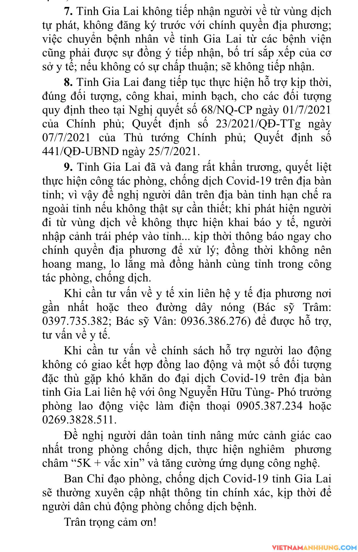 7. Tỉnh Gia Lai không tiếp nhận người về từ vùng dịch tự phát, không đăng ký trước với chính quyền địa phương; việc chuyển bệnh nhân về tỉnh Gia Lai từ các bệnh viện cũng phải được sự đồng ý tiếp nhận, bố trí sắp xếp của cơ sở y tế; nếu không có sự chấp thuận; sẽ không tiếp nhận.