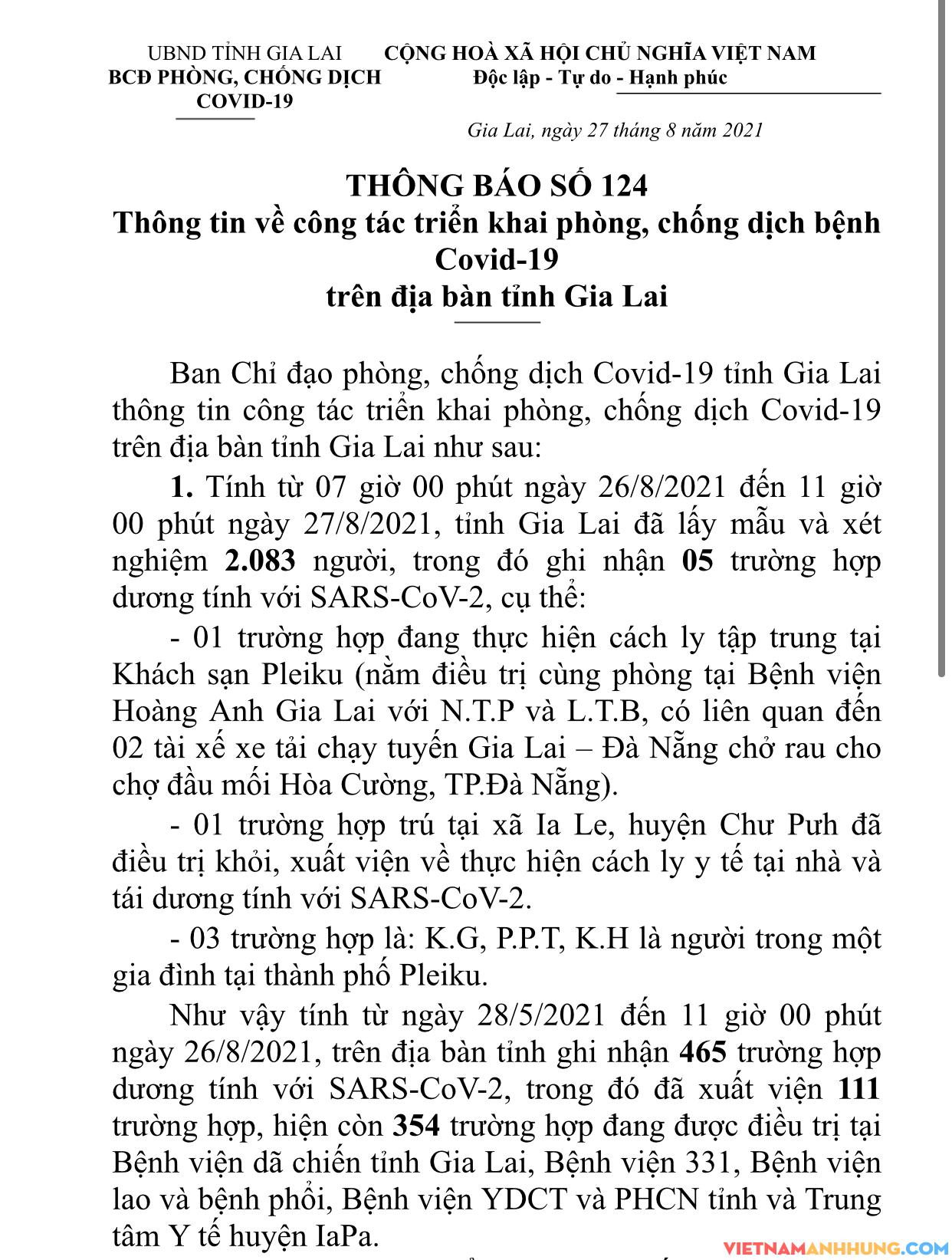 Tính từ 07 giờ 00 phút ngày 26/8/2021 đến 11 giờ 00 phút ngày 27/8/2021, tỉnh Gia Lai đã lấy mẫu và xét nghiệm 2.083 người, trong đó ghi nhận 05 trường hợp dương tính với SARS-CoV-2, cụ thể: