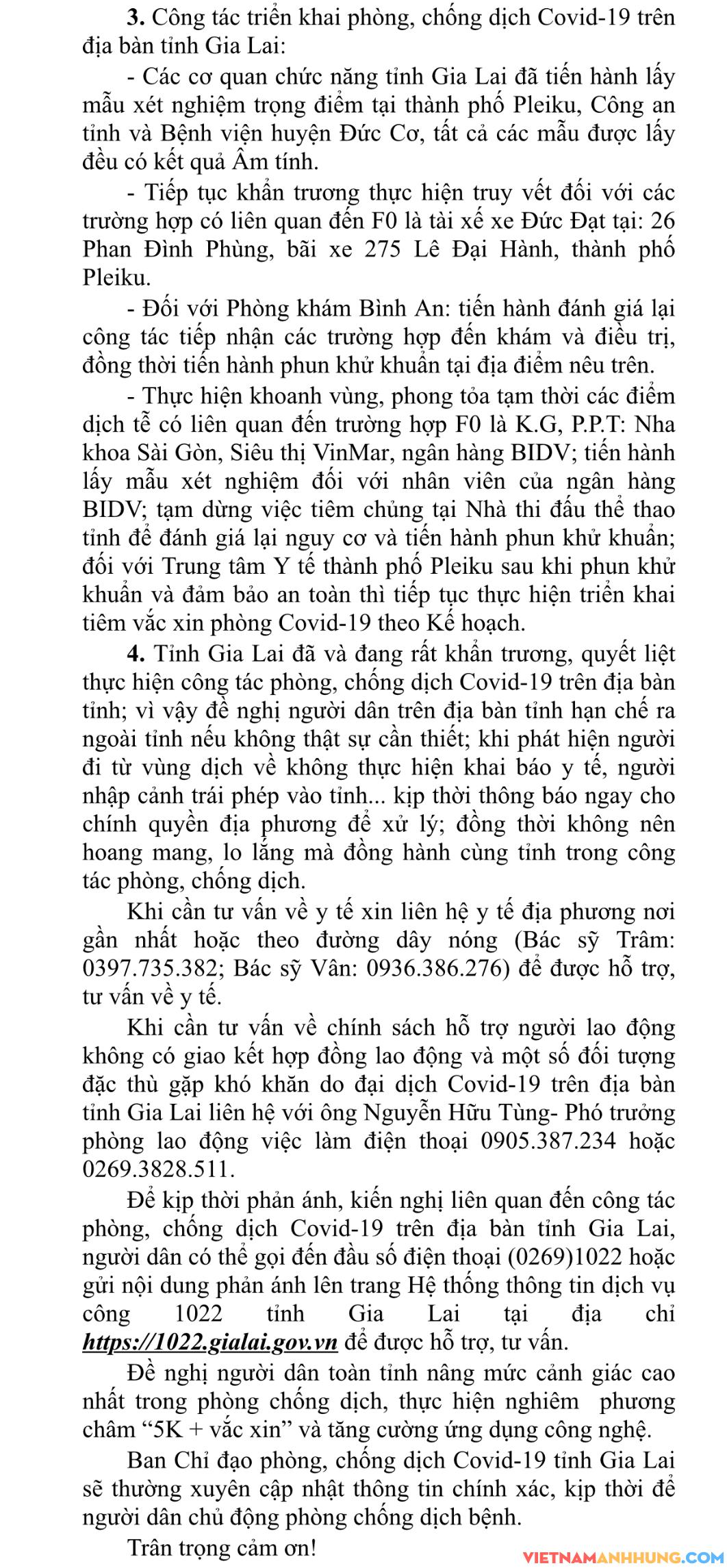 – 01 trường hợp đang thực hiện cách ly tập trung tại Khách sạn Pleiku (nằm điều trị cùng phòng tại Bệnh viện Hoàng Anh Gia Lai với N.T.P và L.T.B, có liên quan đến 02 tài xế xe tải chạy tuyến Gia Lai – Đà Nẵng chở rau cho chợ đầu mối Hòa Cường, TP.Đà Nẵng).
