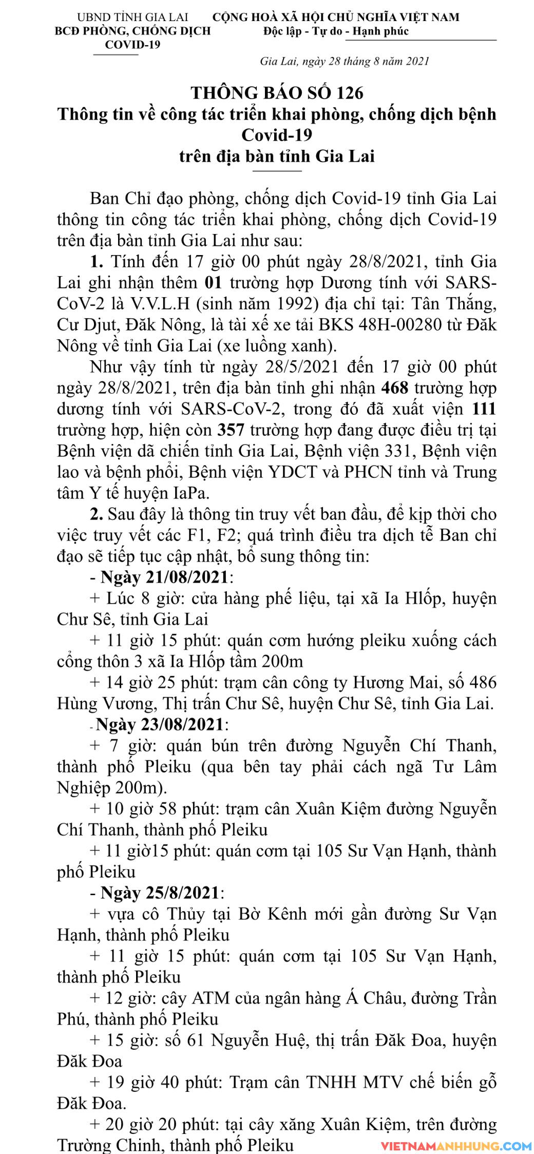 Tính đến 17 giờ 00 phút ngày 28/8/2021, tỉnh Gia Lai ghi nhận thêm 01 trường hợp Dương tính với SARS-CoV-2 là V.V.L.H (sinh năm 1992) địa chỉ tại: Tân Thắng, Cư Djut, Đăk Nông, là tài xế xe tải BKS 48H-00280 từ Đăk Nông về tỉnh Gia Lai (xe luồng xanh).