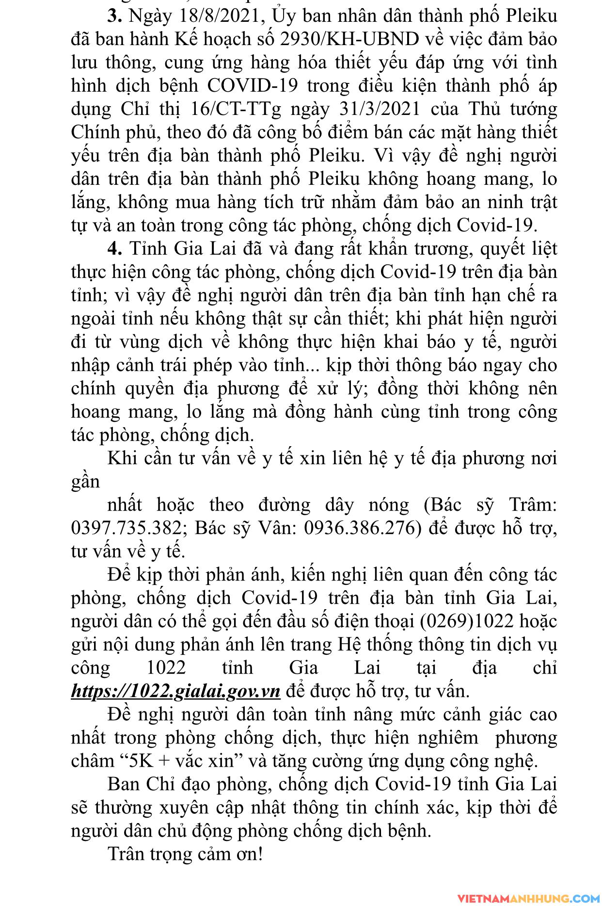 3. Ngày 18/8/2021, Ủy ban nhân dân thành phố Pleiku đã ban hành Kế hoạch số 2930/KH-UBND về việc đảm bảo lưu thông, cung ứng hàng hóa thiết yếu đáp ứng với tình hình dịch bệnh COVID-19 trong điều kiện thành phố áp dụng Chỉ thị 16/CT-TTg ngày 31/3/2021 của Thủ tướng Chính phủ, theo đó đã công bố điểm bán các mặt hàng thiết yếu trên địa bàn thành phố Pleiku. Vì vậy đề nghị người dân trên địa bàn thành phố Pleiku không hoang mang, lo lắng, không mua hàng tích trữ nhằm đảm bảo an ninh trật tự và an toàn trong công tác phòng, chống dịch Covid-19.