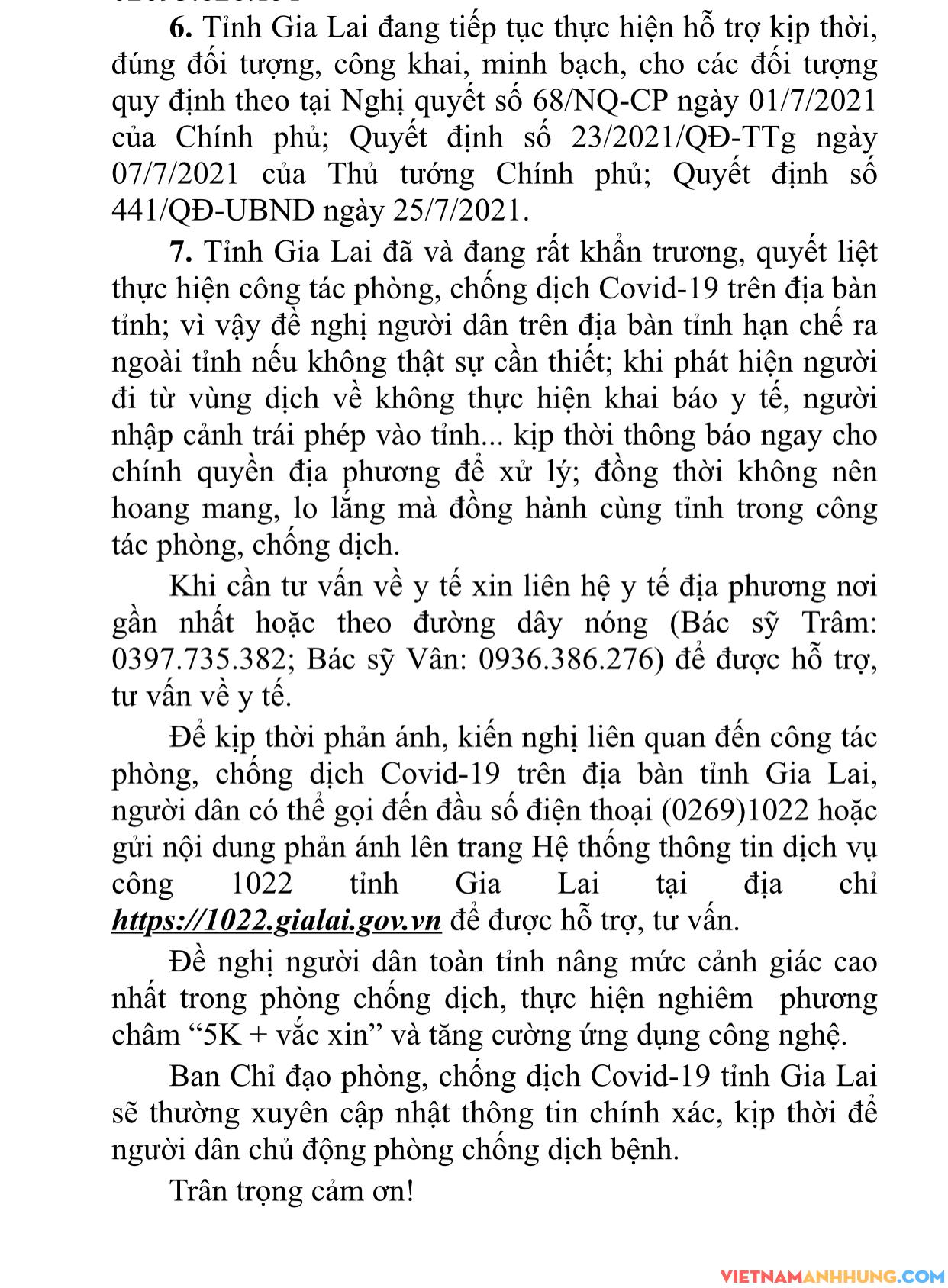 – Đối với vận tải hành khách: Dừng tất cả hoạt động vận tải hành khách công cộng (xe tuyến cố định, xe hợp đồng, xe buýt, xe du lịch, xe taxi) có điểm đi, điểm đến xuất phát từ thành phố Pleiku, tỉnh Gia Lai. Trừ các trường hợp đặc biệt vì lý do công vụ, xe đưa đón công nhân, chuyên gia, người cách ly và các nhiệm vụ khẩn cấp khác được sự cho phép của cơ quan có thẩm quyền. Hoạt động vận chuyển hành khách công cộng của phương tiện thuộc các tỉnh, thành phố trên cả nước có hành trình qua thành phố Pleiku, tỉnh Gia Lai thì không được dừng, đỗ để đón, trả khách.