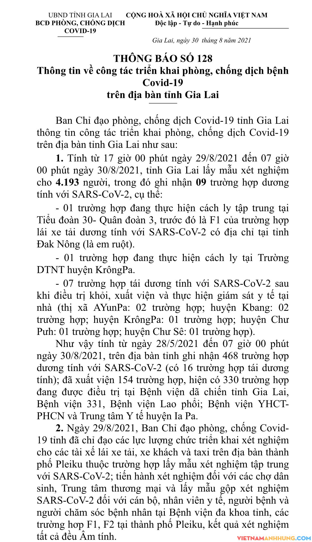 Như vậy tính từ ngày 28/5/2021 đến 07 giờ 00 phút ngày 30/8/2021, trên địa bàn tỉnh ghi nhận 468 trường hợp dương tính với SARS-CoV-2 (có 16 trường hợp tái dương tính); đã xuất viện 154 trường hợp, hiện có 330 trường hợp đang được điều trị tại Bệnh viện dã chiến tỉnh Gia Lai, Bệnh viện 331, Bệnh viện Lao phổi; Bệnh viện YHCT-PHCN và Trung tâm Y tế huyện Ia Pa.