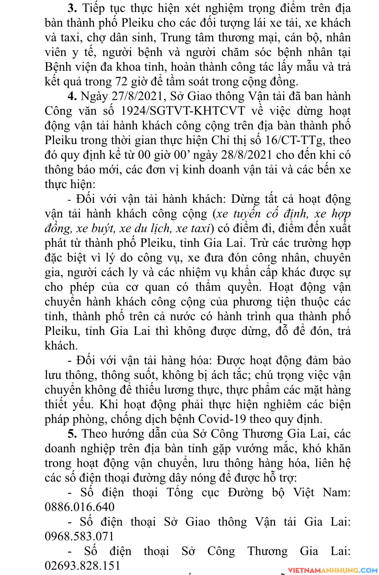 4. Ngày 27/8/2021, Sở Giao thông Vận tải đã ban hành Công văn số 1924/SGTVT-KHTCVT về việc dừng hoạt động vận tải hành khách công cộng trên địa bàn thành phố Pleiku trong thời gian thực hiện Chỉ thị số 16/CT-TTg, theo đó quy định kể từ 00 giờ 00’ ngày 28/8/2021 cho đến khi có thông báo mới, các đơn vị kinh doanh vận tải và các bến xe thực hiện: