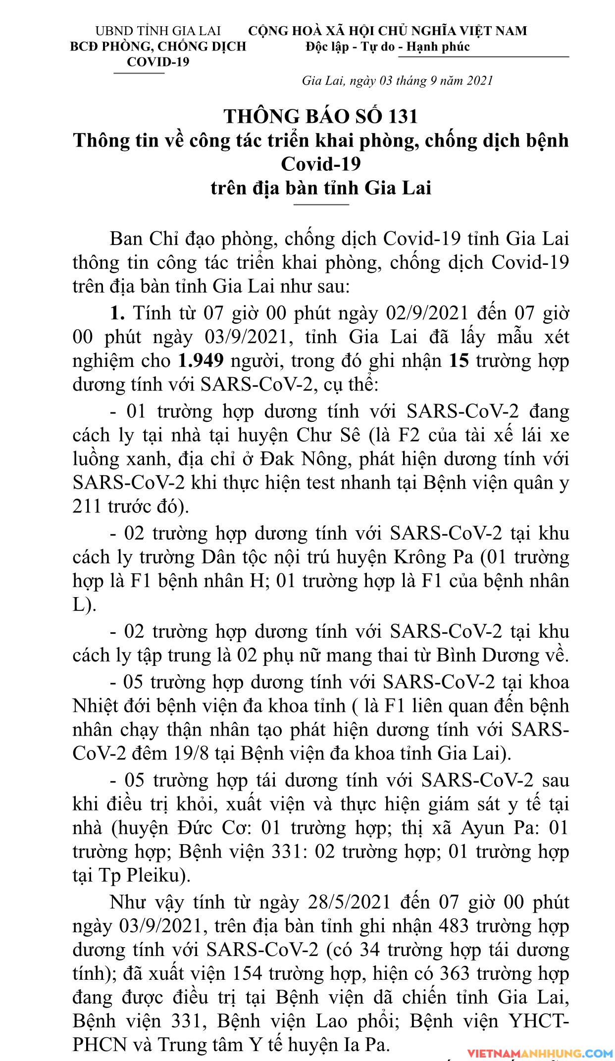 Tính từ 07 giờ 00 phút ngày 02/9/2021 đến 07 giờ00 phút ngày 03/9/2021, tỉnh Gia Lai đã lấy mẫu xét nghiệm cho 1.949 người, trong đó ghi nhận 15 trường hợp dương tính với SARS-CoV-2, cụ thể: