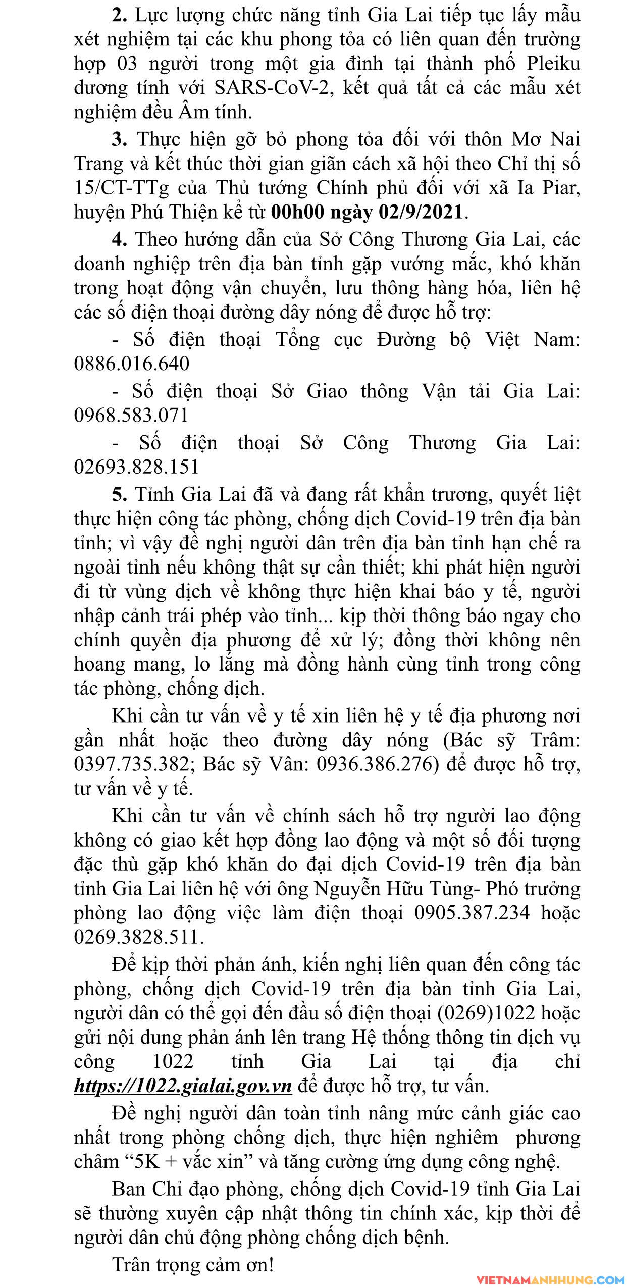 3. Thực hiện gỡ bỏ phong tỏa đối với thôn Mơ Nai Trang và kết thúc thời gian giãn cách xã hội theo Chỉ thị số 15/CT-TTg của Thủ tướng Chính phủ đối với xã Ia Piar, huyện Phú Thiện kể từ 00h00 ngày 02/9/2021.