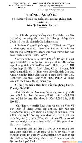 1. Tính từ 07 giờ 00 phút ngày 24/9/2021 đến 07 giờ00 phút ngày 25/9/2021, tỉnh Gia Lai đã lấy mẫu xét nghiệm cho 1.080 người, không ghi nhận trường hợp nào dương tính mới với SARS-CoV-2.