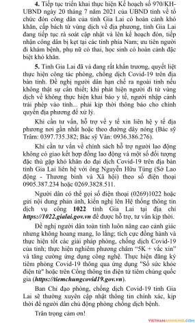 4. Tiếp tục triển khai thực hiện Kế hoạch số 970/KH-UBND ngày 20 tháng 7 năm 2021 của UBND tỉnh về tổ chức đón công dân của tỉnh Gia Lai có hoàn cảnh khó khăn, cấp bách từ vùng dịch về địa phương, tỉnh Gia Lai đang tiếp tục rà soát cập nhật và lên kế hoạch đón, tiếp nhận công dân bị kẹt tại các tỉnh phía Nam; ưu tiên người đi khám bệnh, phụ nữ có thai, học sinh có hoàn cảnh đặc biệt khó khăn.