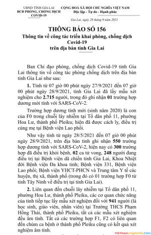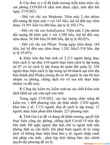 1. Tính từ 07 giờ 00 phút ngày 27/9/2021 đến 07 giờ00 phút ngày 28/9/2021, tỉnh Gia Lai đã lấy mẫu xét nghiệm cho 2.715 người, trong đó ghi nhận 01 trường hợp dương mới tính với SARS-CoV-2.