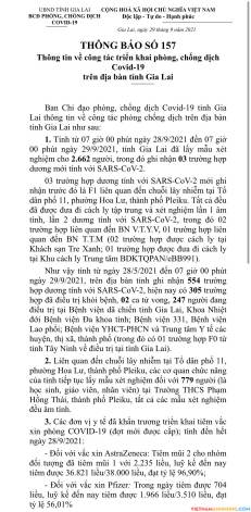 1. Tính từ 07 giờ 00 phút ngày 28/9/2021 đến 07 giờ00 phút ngày 29/9/2021, tỉnh Gia Lai đã lấy mẫu xét nghiệm cho 2.662 người, trong đó ghi nhận 03 trường hợp dương mới tính với SARS-CoV-2.