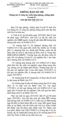 1. Tính từ 07 giờ 00 phút ngày 29/9/2021 đến 07 giờ00 phút ngày 30/9/2021, tỉnh Gia Lai đã lấy mẫu xét nghiệm cho 2.843 người, trong đó ghi nhận 04 trường hợp dương tính mới với SARS-CoV-2.