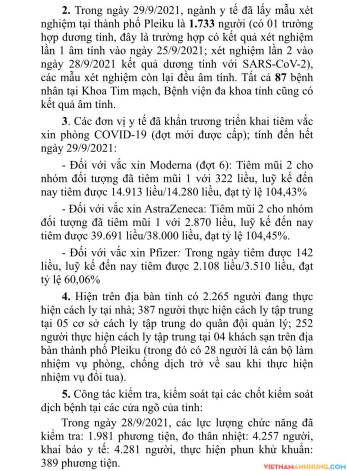 2. Trong ngày 29/9/2021, ngành y tế đã lấy mẫu xét nghiệm tại thành phố Pleiku là 1.733 người (có 01 trường hợp dương tính, đây là trường hợp có kết quả xét nghiệm lần 1 âm tính vào ngày 25/9/2021; xét nghiệm lần 2 vào ngày 28/9/2021 kết quả dương tính với SARS-CoV-2), các mẫu xét nghiệm còn lại đều âm tính. Tất cả 87 bệnh nhân tại Khoa Tim mạch, Bệnh viện đa khoa tỉnh cũng có kết quả âm tính.