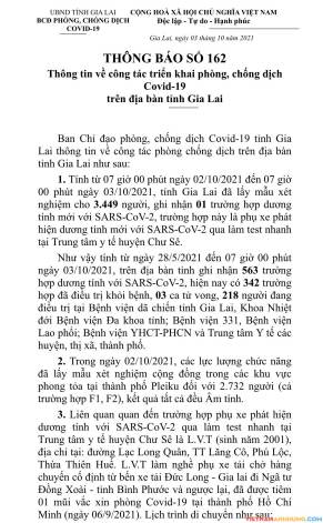 1. Tính từ 07 giờ 00 phút ngày 02/10/2021 đến 07 giờ00 phút ngày 03/10/2021, tỉnh Gia Lai đã lấy mẫu xét nghiệm cho 3.449 người, ghi nhận 01 trường hợp dương tính mới với SARS-CoV-2, trường hợp này là phụ xe phát hiện dương tính mới với SARS-CoV-2 qua làm test nhanh tại Trung tâm y tế huyện Chư Sê.