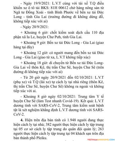 – Từ 20 giờ ngày 20/9/2021 đến 02/10/2021: L.V.T (phụ xe) và T.Q (lái xe) tự cách ly tại nhà riêng (thôn Kê, thị trấn Chư Sê, huyện Chư Sê) không ra ngoài và không tiếp xúc với ai.