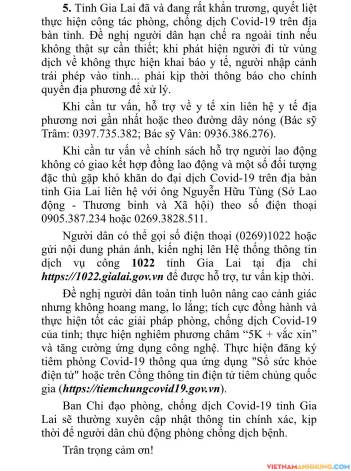 5. Tỉnh Gia Lai đã và đang rất khẩn trương, quyết liệt thực hiện công tác phòng, chống dịch Covid-19 trên địa bàn tỉnh. Đề nghị người dân hạn chế ra ngoài tỉnh nếu không thật sự cần thiết; khi phát hiện người đi từ vùng dịch về không thực hiện khai báo y tế, người nhập cảnh trái phép vào tỉnh… phải kịp thời thông báo cho chính quyền địa phương để xử lý.